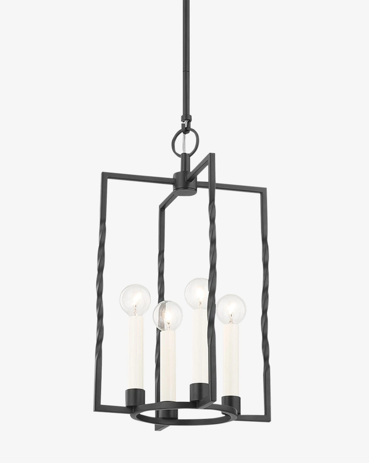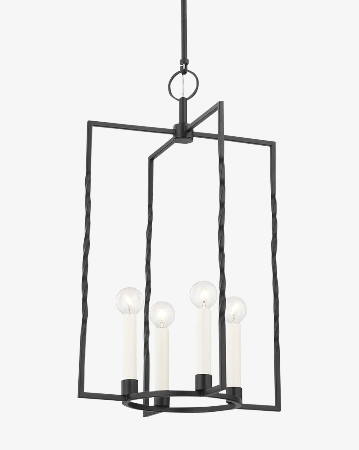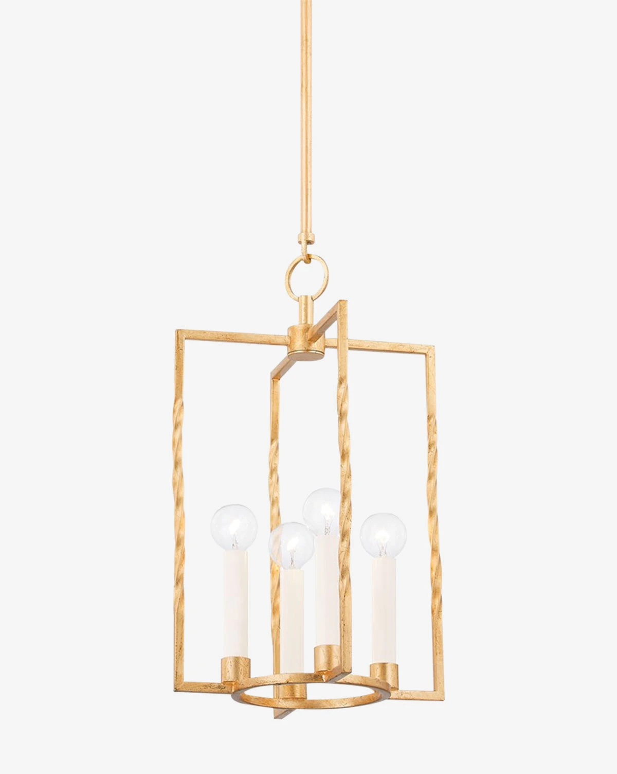 The Adelaide Lantern is inspired by traditional design but given a modern update through its mix of both circular and linear forms and its contemporary candelabra. A twisted metal frame with four lights in either a vintage gold leaf or textured black finish, this lantern is a beautiful addition to the entryway, dining, or kitchen area.