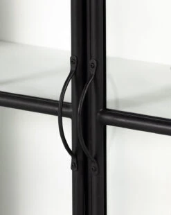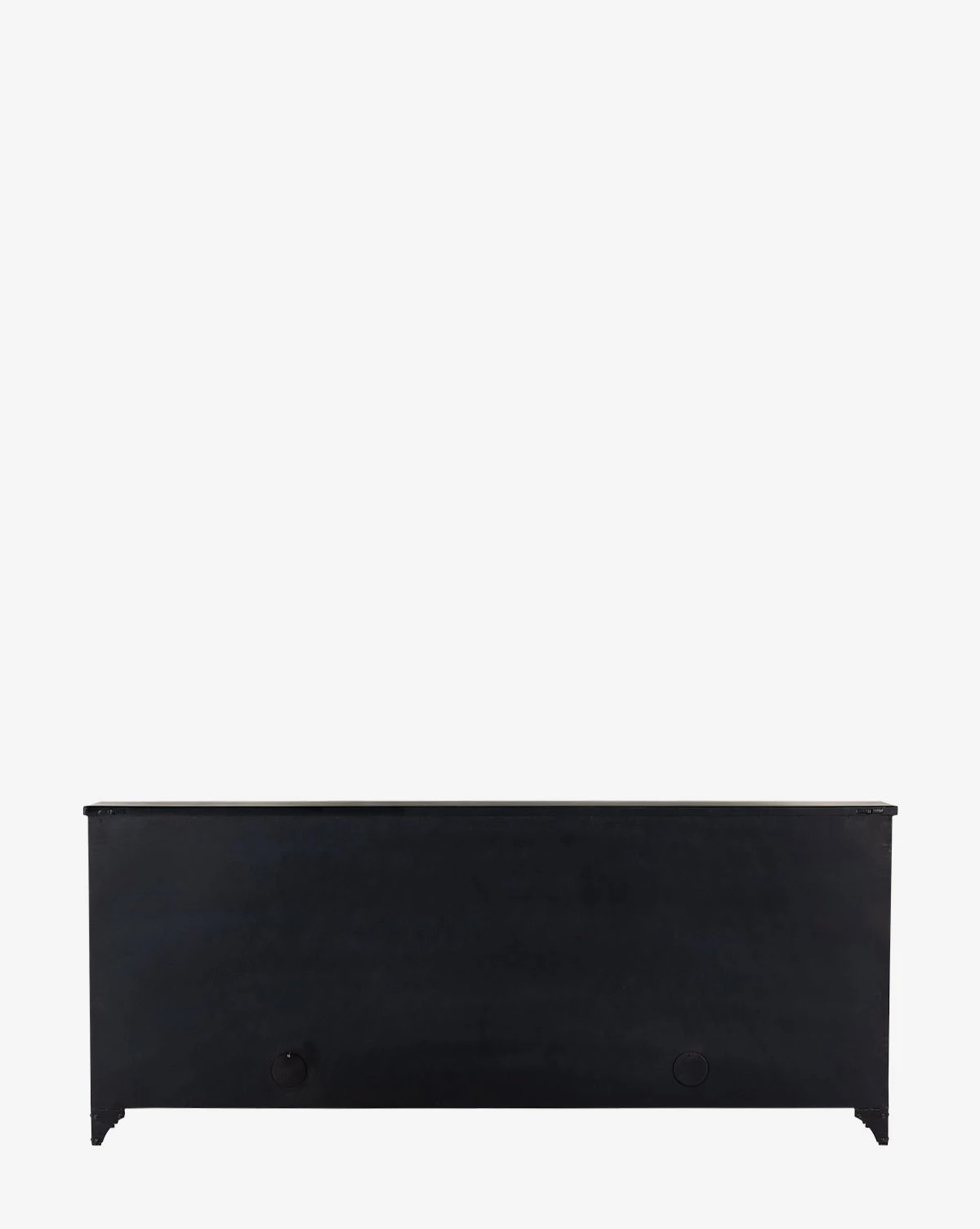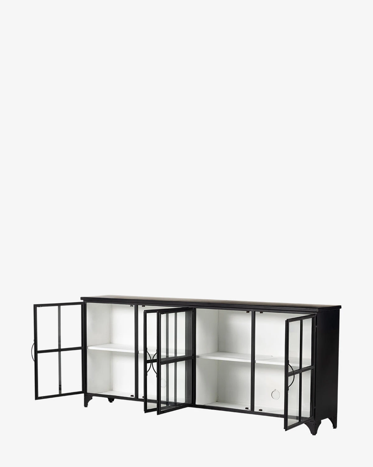 The Amalie Sideboard was designed for enhancing displays, while maximizing storage. A black iron frame is juxtaposed with a stark white interior. Windowpane details on its open-front glass doors create structure and sections to help you style with books, serveware, or both!