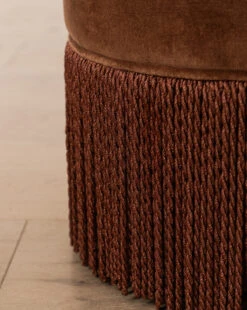 Upholstered in velvet with a long, playful cotton fringe, the Astrid Fringe Stool calls back to mid-century design with a modern approach. A statement piece that embraces retro style, the Astrid Fringe Stool features four wooden natural bun feet tucked behind the fringe, and its soft cushioned seat makes it as practical as it is eye-catching.