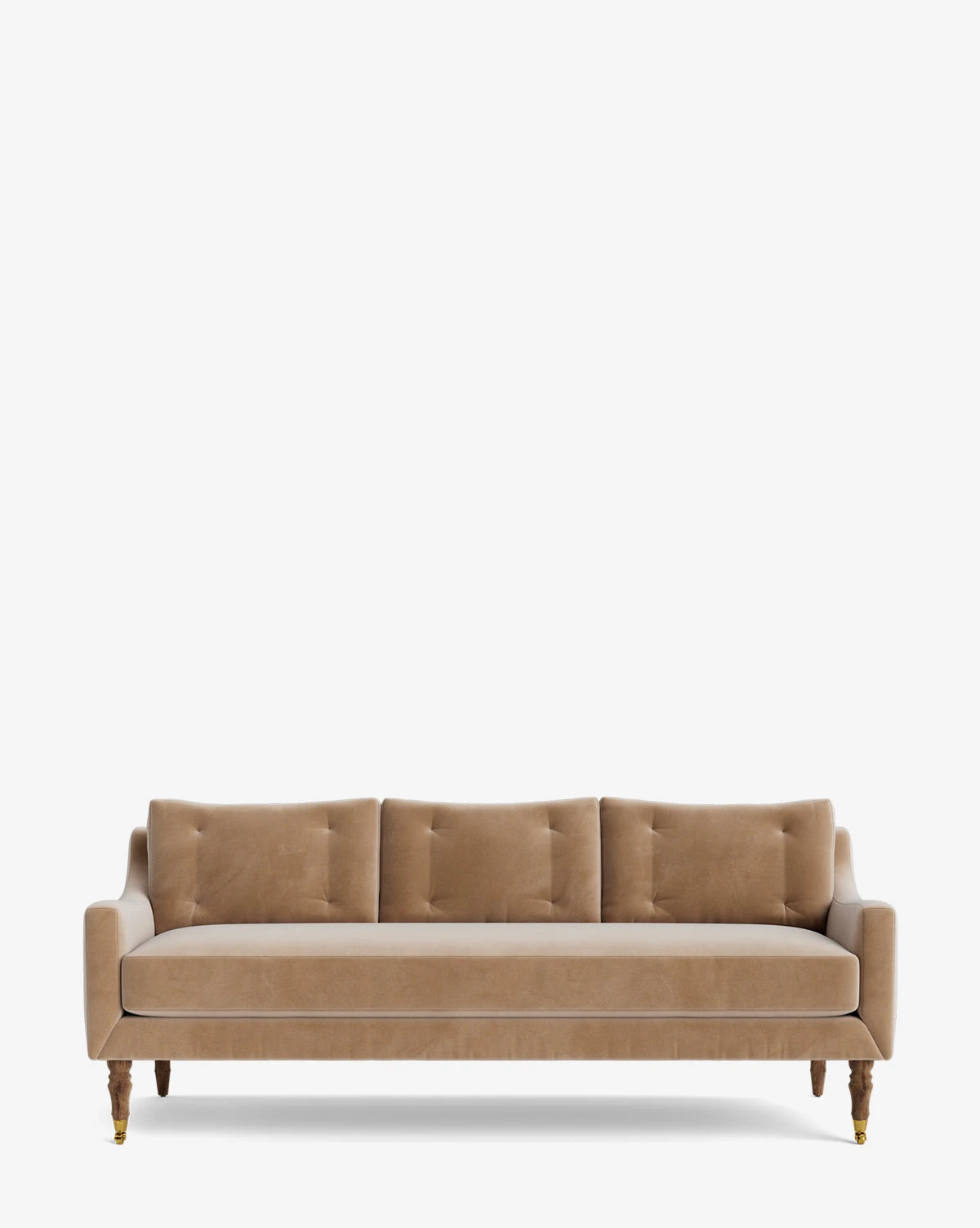 With tufted cushions and decorative legs, the Barden Sofa gives a modern update to traditional elements. Its reeded wood legs give nod to turn of the century style and are fitted with brass caps, while its single upholstered cushion gives a refreshingly minimal tone to the piece. Beautiful in form while functionally comfortable, the Barden Sofa comes in a variety of colorways.