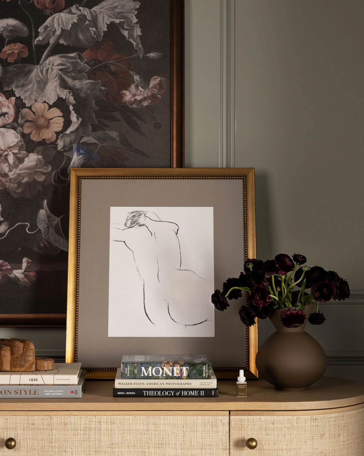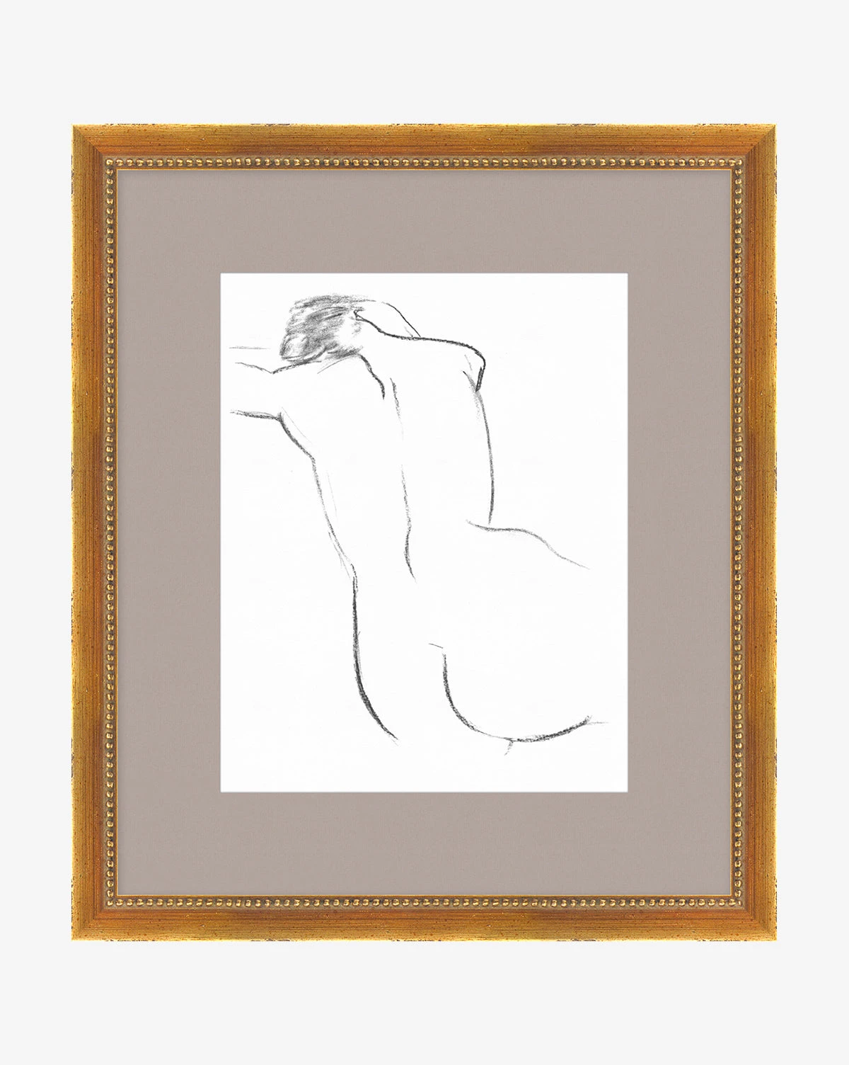 A minimalistic outline of a posed person, Bare features simple pencil strokes. Its composition is captivating, elevating the decor in your space. With a distressed antique gold frame, the piece has a sophisticated feel with gallery-quality materials.