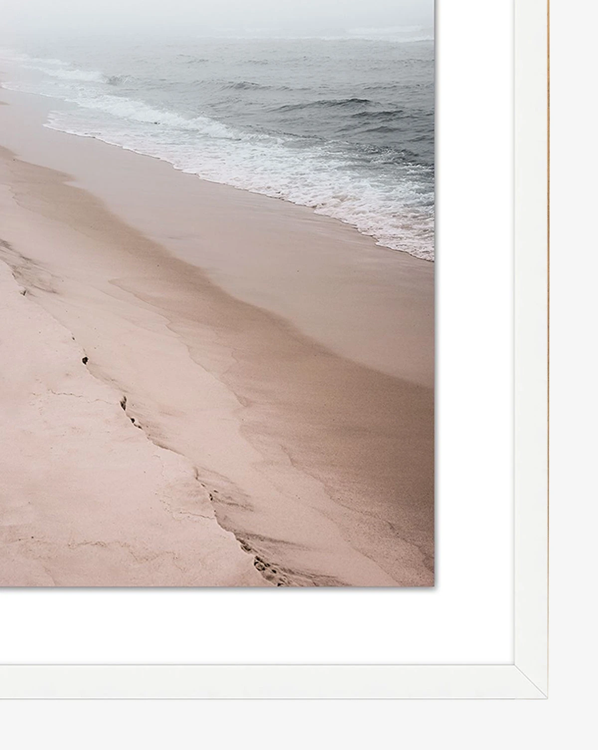 Almost ethereal, Beach Walk into the Fog is a photograph with a visceral quality, pulling the viewer into the piece with its airy palette and long lines. Straight cut and floated on mat, this piece is giclee printed on matte paper and framed in matte white wood with a glass encasing. Â