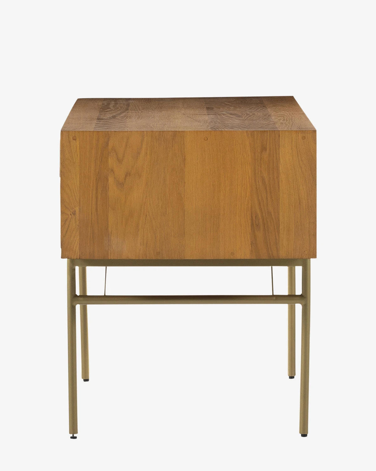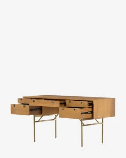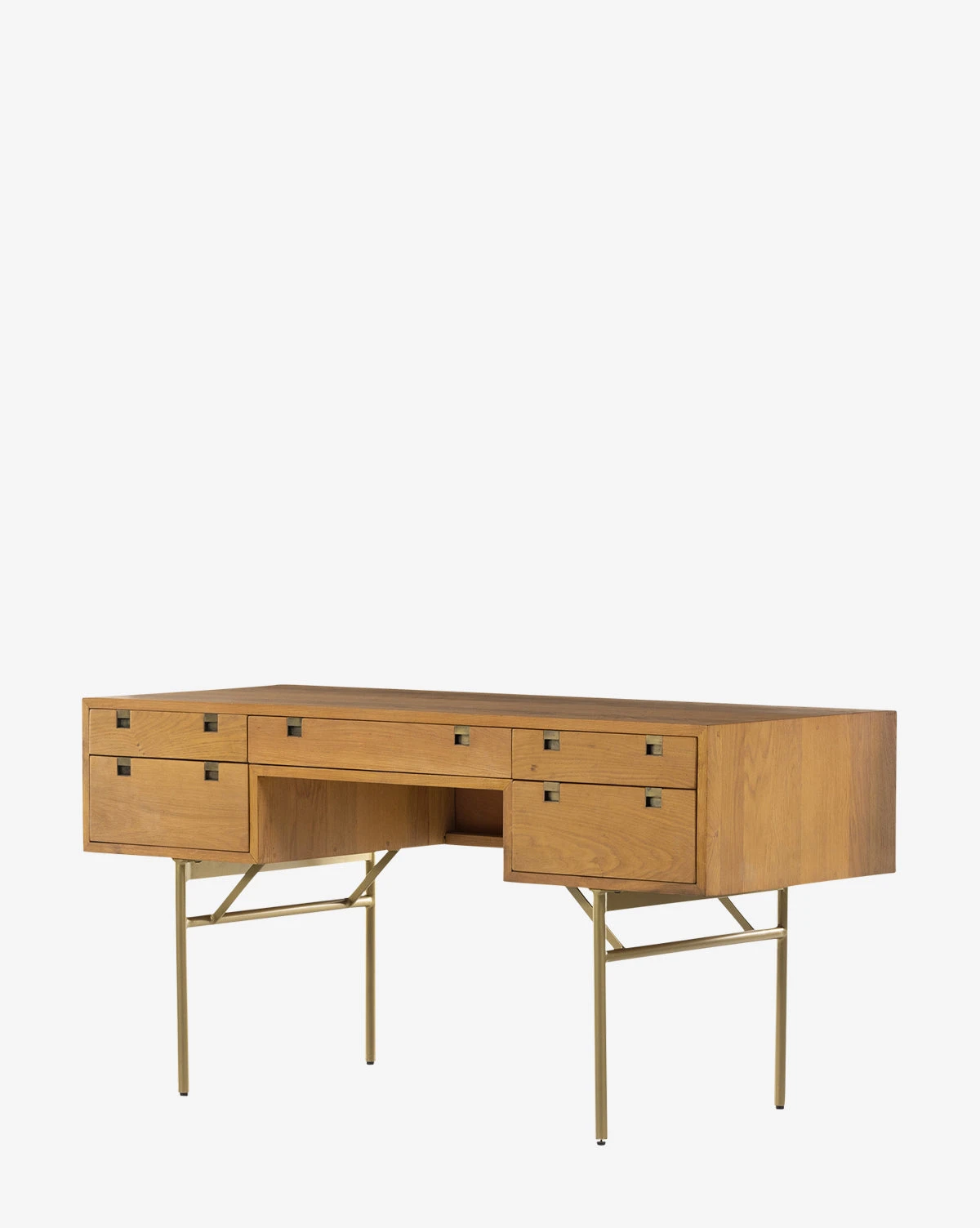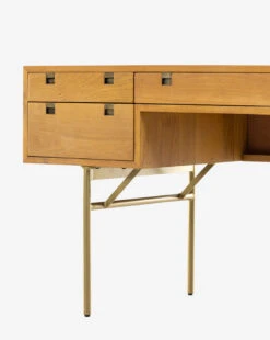 Giving both utility and style to your space, the Betsey Desk incorporates five functional drawers with squared hardware into its Danish-inspired design. The streamlined structure made with solid natural oak is supported by sleek iron legs finished in satin brass.