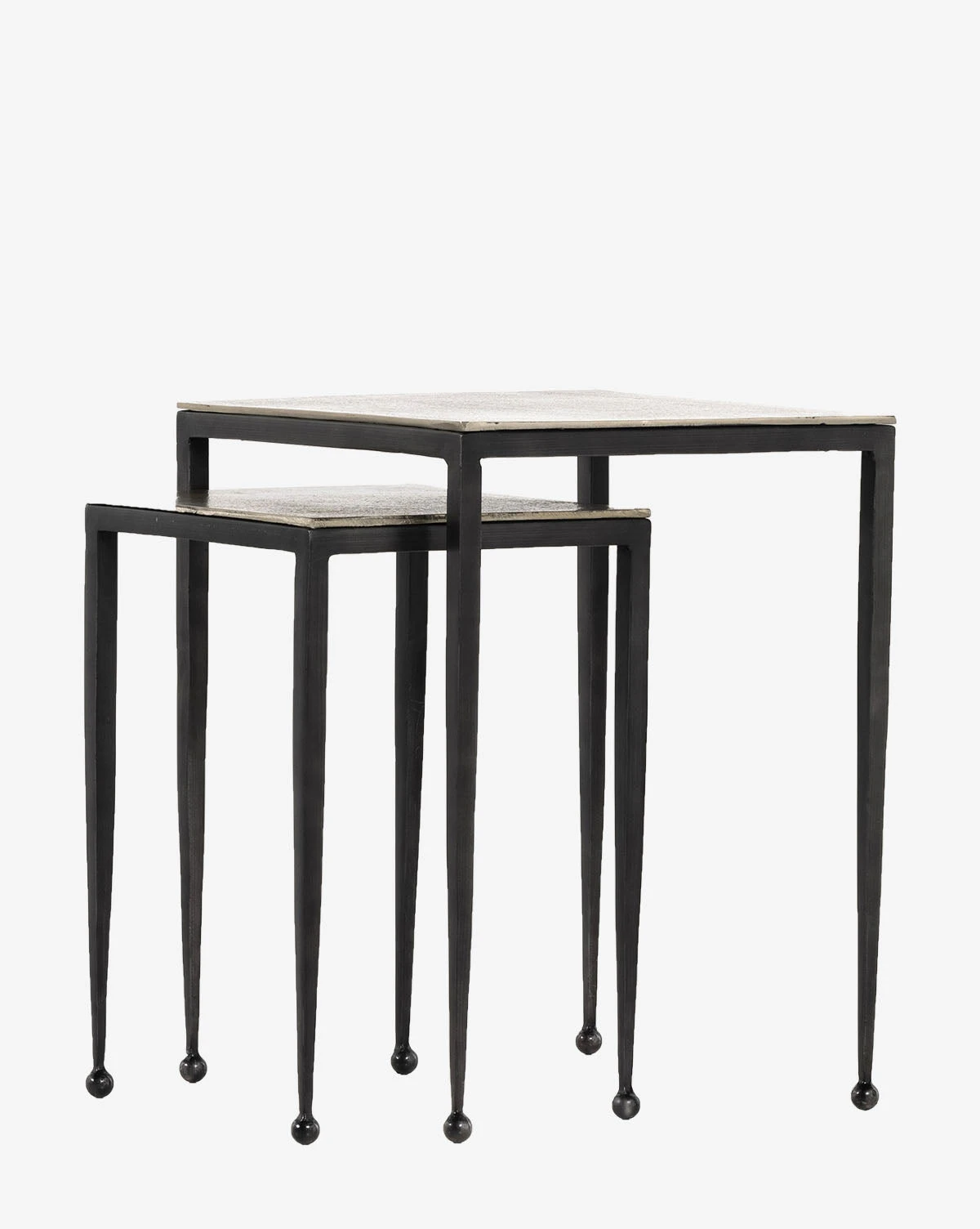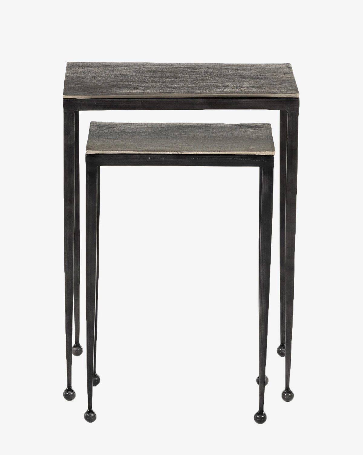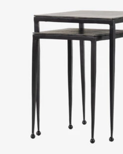 Creating long, slender lines, the Biddy Nesting End Tables have elongated legs featuring rounded feet. This small detail is impactful, giving a sense of balance to its legs and squared-off tabletop. Finished using a wire-brushed technique, the piece has swirling tones that are powder-coated and lacquered to create dimension and depth inspired by antique furniture.