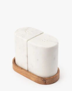 With thoughtfully paired materials, the Marble Salt & Pepper Shakers add natural detail to your tabletop decor. Made from marble in a shapely design and resting in an acacia wood tray, the shakers add both function and beauty to your dining area.