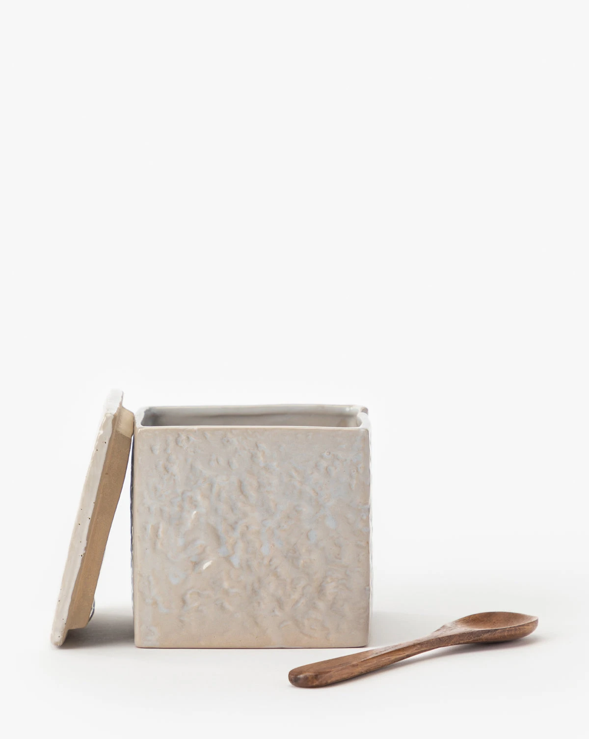 With a shapely and rustic design, the Stoneware Salt Cellar with Wooden Spoon is made of stoneware with a white reactive glaze. The wooden spoon addition creates a textural mix of materials and brings a practical and welcoming detail to your kitchen countertops.