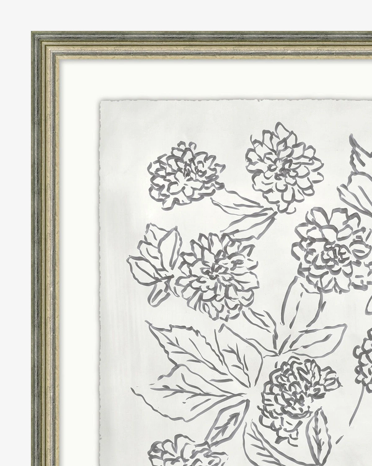 In a monochromatic palette featuring a delicate yet confident sketch of blossoms, Blossom Sketch 4 is incredibly charming. A giclee print on watercolor paper, this piece is deckled and floated on mat in a silver-leaf etched frame.