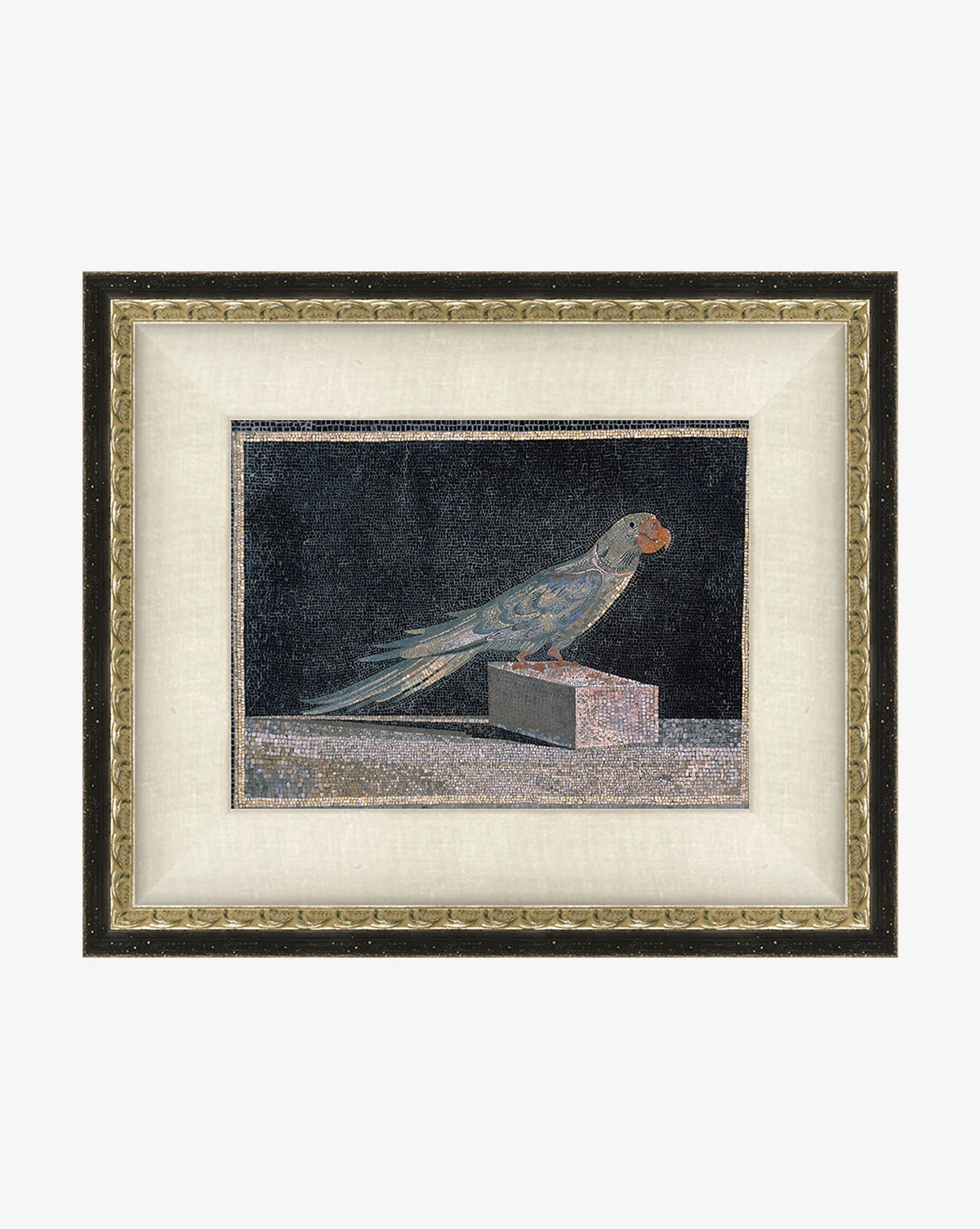 An intricate giclee print of a mosaic, Blue Parrot is a unique study in detail. With aquatic blue and neutral stone hues, this coastal artwork is complemented by a distressed black and silver finished wood frame.Â