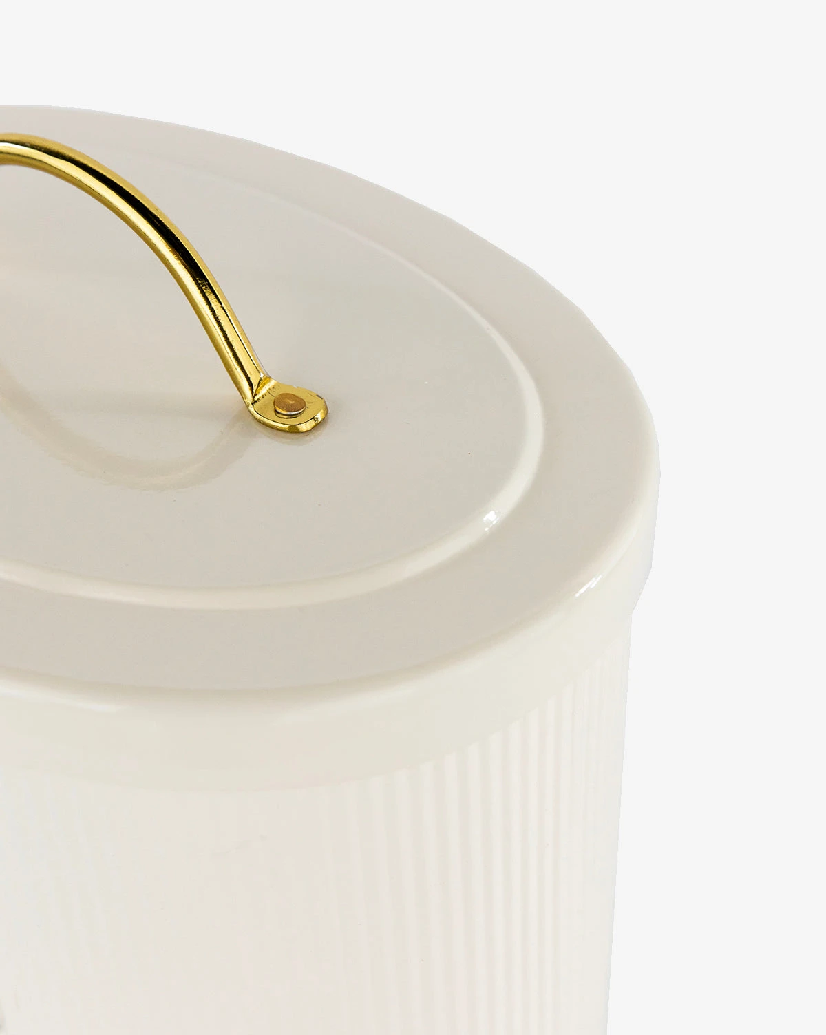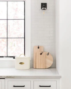 Keep your bread fresh with our Brass Detailed Metal Bread Box. An oval shape and slight ribbed detail give a delicate touch to its metal form. Finished with an oval brass “BREAD” stamp, and matching brass handle, this box looks just as good styled in your open shelving as it does filled with your favorite breads.