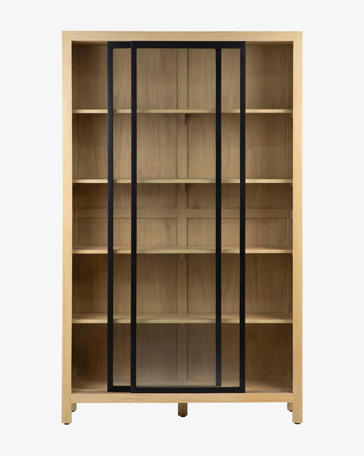 Made of mindi wood in a blonde finish, the Bromley Cabinet is sleek in its style and dramatic in its scale. The natural details of the wood bring detail to the neutral cabinet while sliding glass doors framed in iron enclose generous interior shelving.