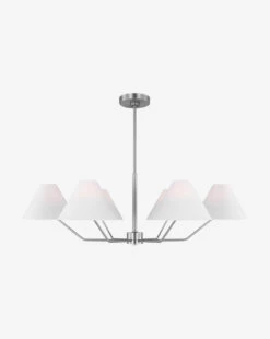 Sleek and angular, the Burke Chandelier boasts thoughtful craftsmanship with its subtle details. The steel structure is finished in one of three timeless finishes to complement the white linen shades. With its modern silhouette, the chandelier casts beautiful light into your space.