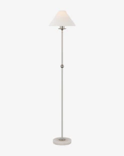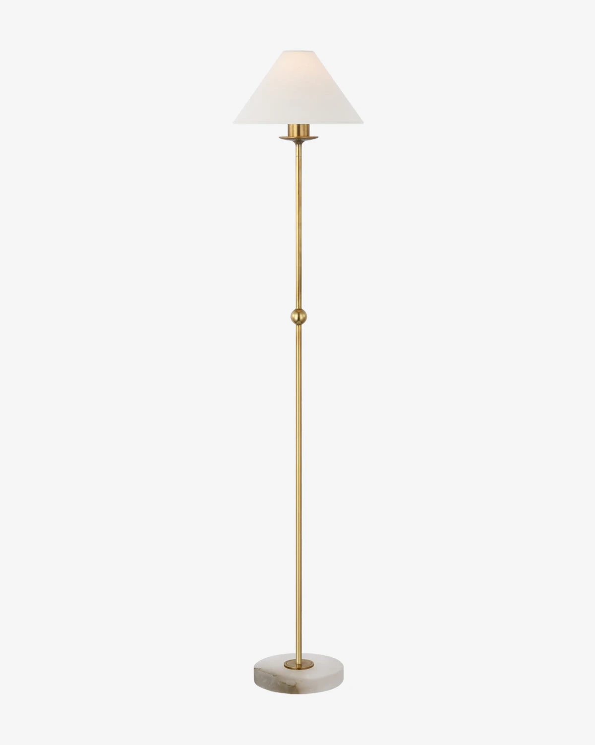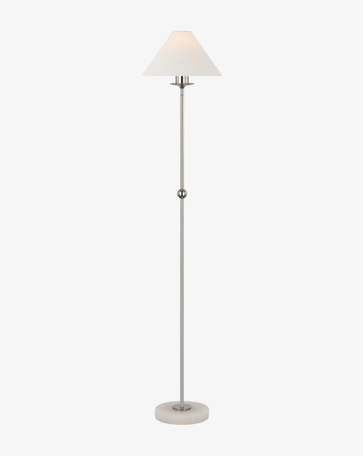In an updated take on the classic floor lamp, the Caspian Floor Lamp features a ball detailing and a round marble base. Its linen shade allows light to elegantly diffuse into the space, and its dimmable feature allows you to customize brightness.