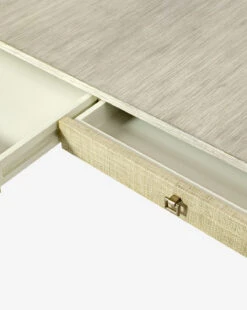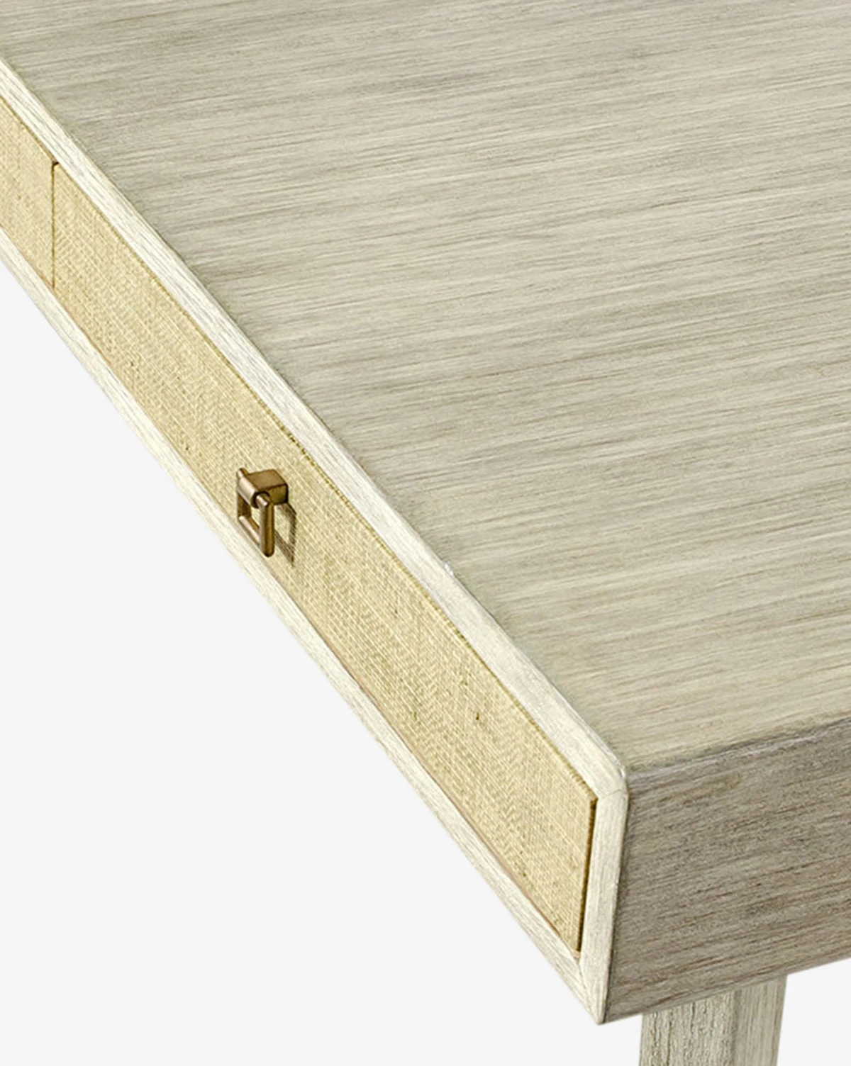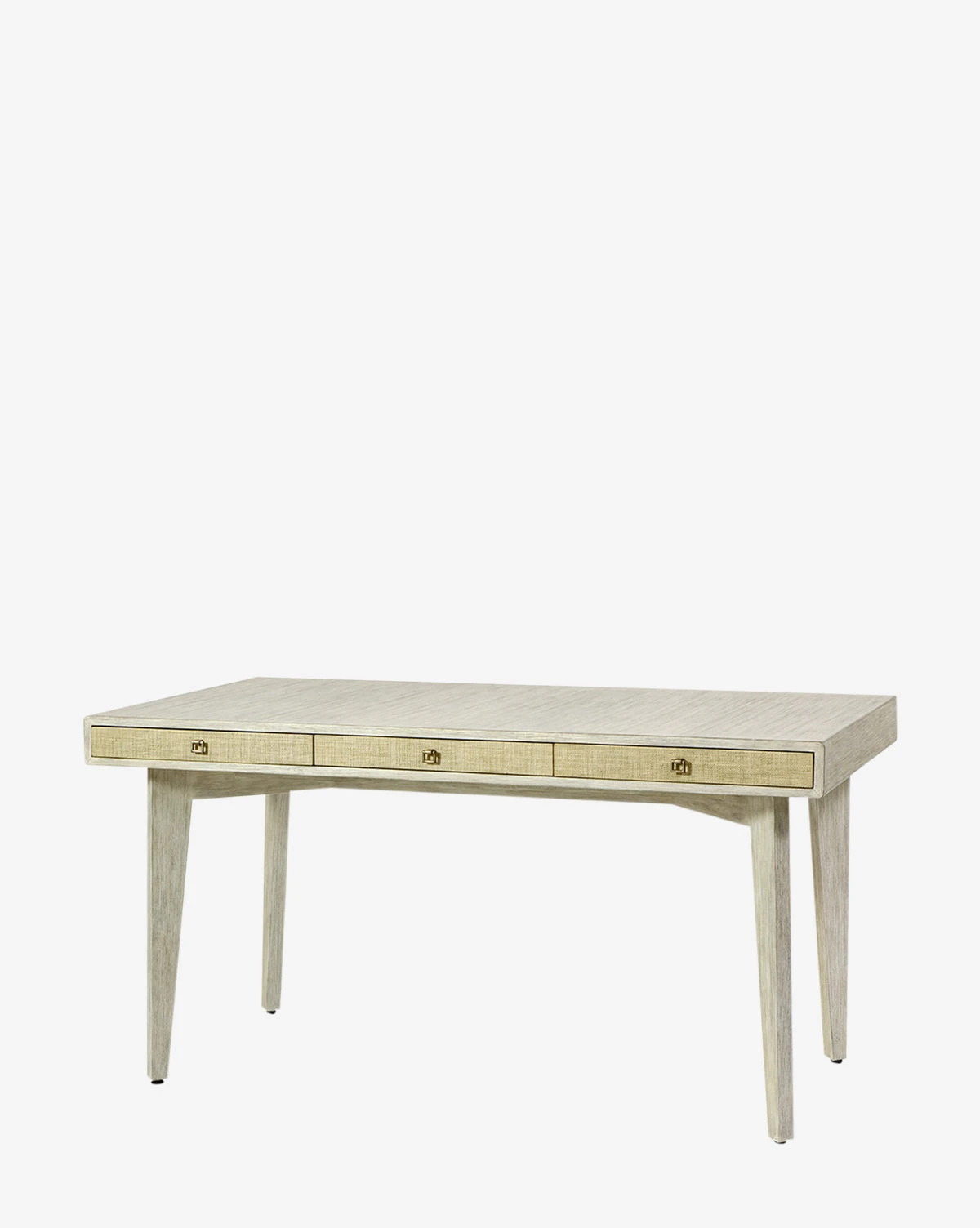 Coastal and textural, the Chastin Desk is an updated take on the classic neutral desk. Its hardwood structure is finished in a white-gray two-tone finish and supported by sleek, angled legs. The drawers frame hand-stamped raffia and brass hardware, adding depth and character to your home office.