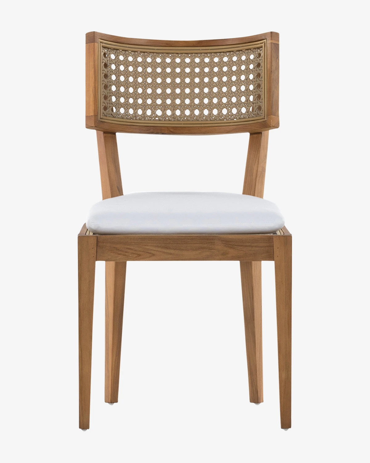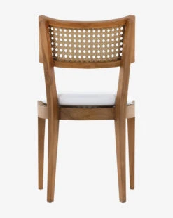 In a charmingly classic style and crafted with modern materials, the Chester Outdoor Dining Chair brings the beauty of indoor dining outdoors. With a gently curved backing with a rattan-inspired inlay, the chair’s details complement its solid teak frame. The simple cushion brings lasting comfort to your dining set with its UV-resistant and water-repellent qualities.