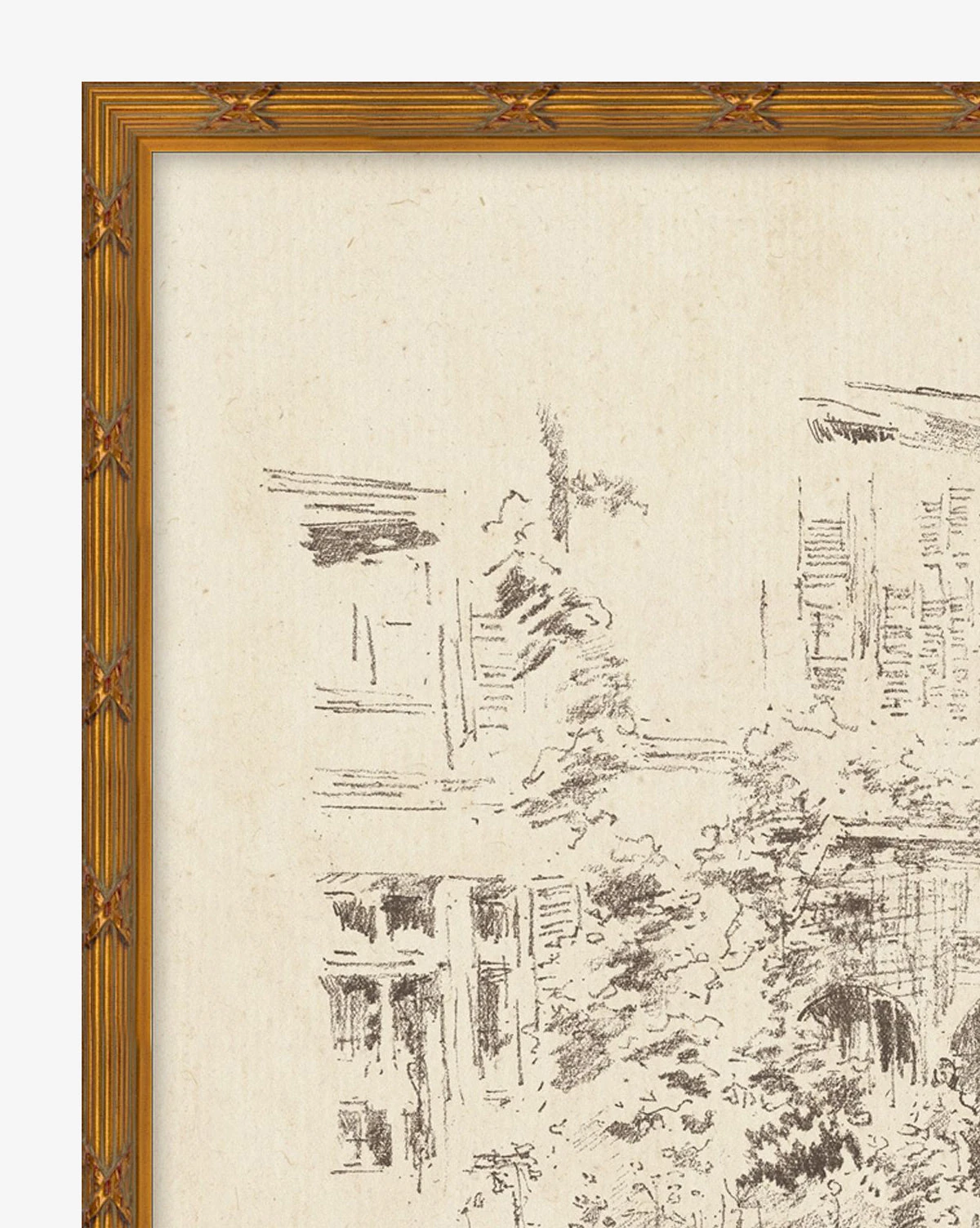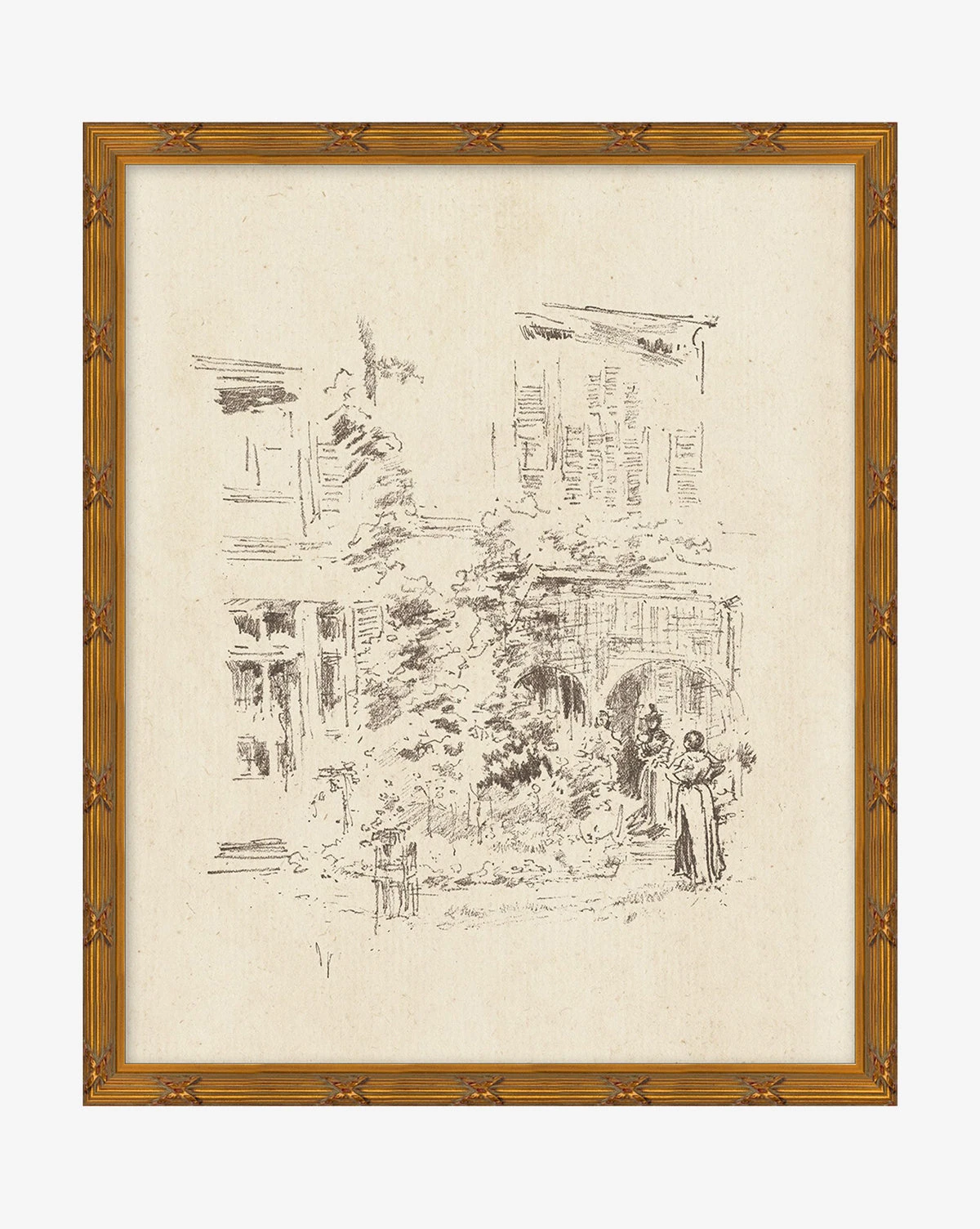 With subtle linework, City Sketch has the feel of a vintage illustration. The sketch depicts a beautiful exterior of a building with foliage and citizens going about their day. Presented on matte paper, the artwork is framed with espresso work.ย ย