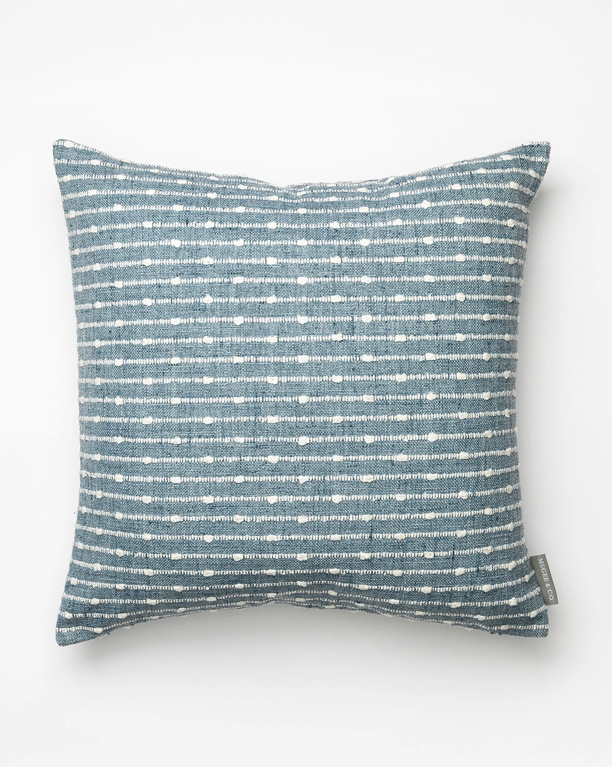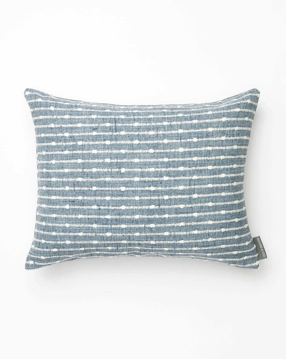 Detailed thread work gives the Claudette Blue Pillow Cover its unique character. Available in a beautiful colorway, this textile has a pattern of soft stripes punctuated with dots of heavy thread work that make a simple statement, lending versatility to changing styles in children’s bedrooms.