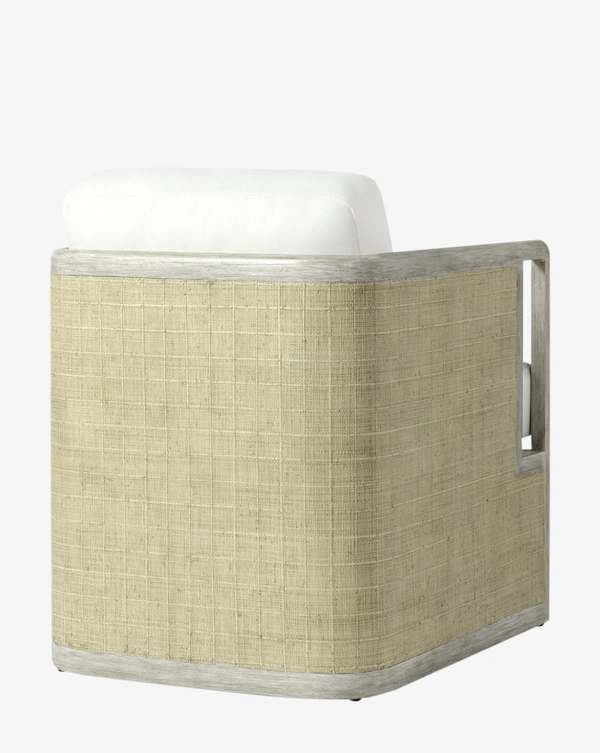 An updated take on the traditional chair, the Coben Lounge Chair features a wrap-around frame with modern open panes on each arm. Crafted from hardwood in a two-tone white and gray finish, it is completed with a hand-stamped, performance-rated raffia in a natural brown wash. White loose cushions are nestled into the frame, creating a comfortable, inviting space to settle in.