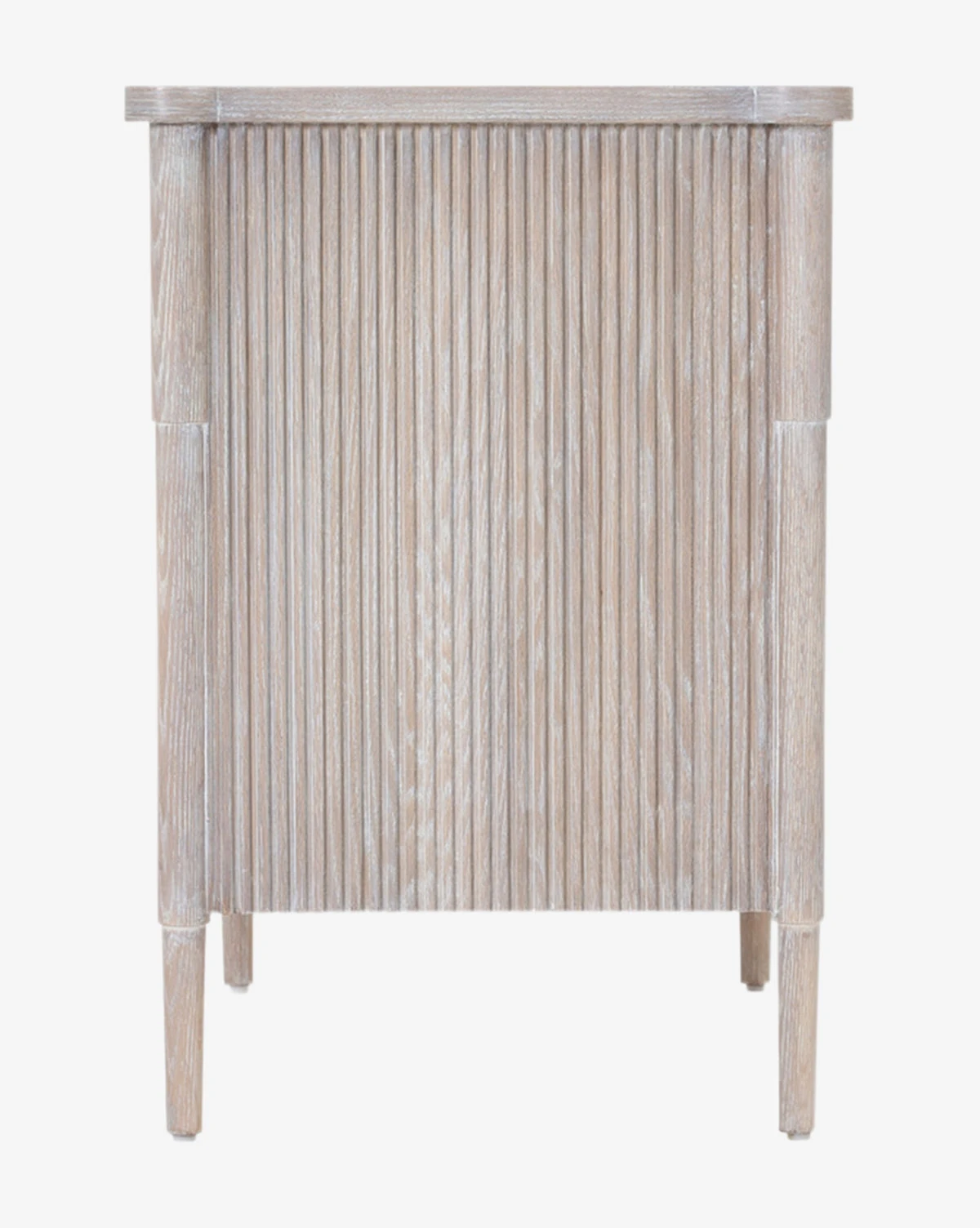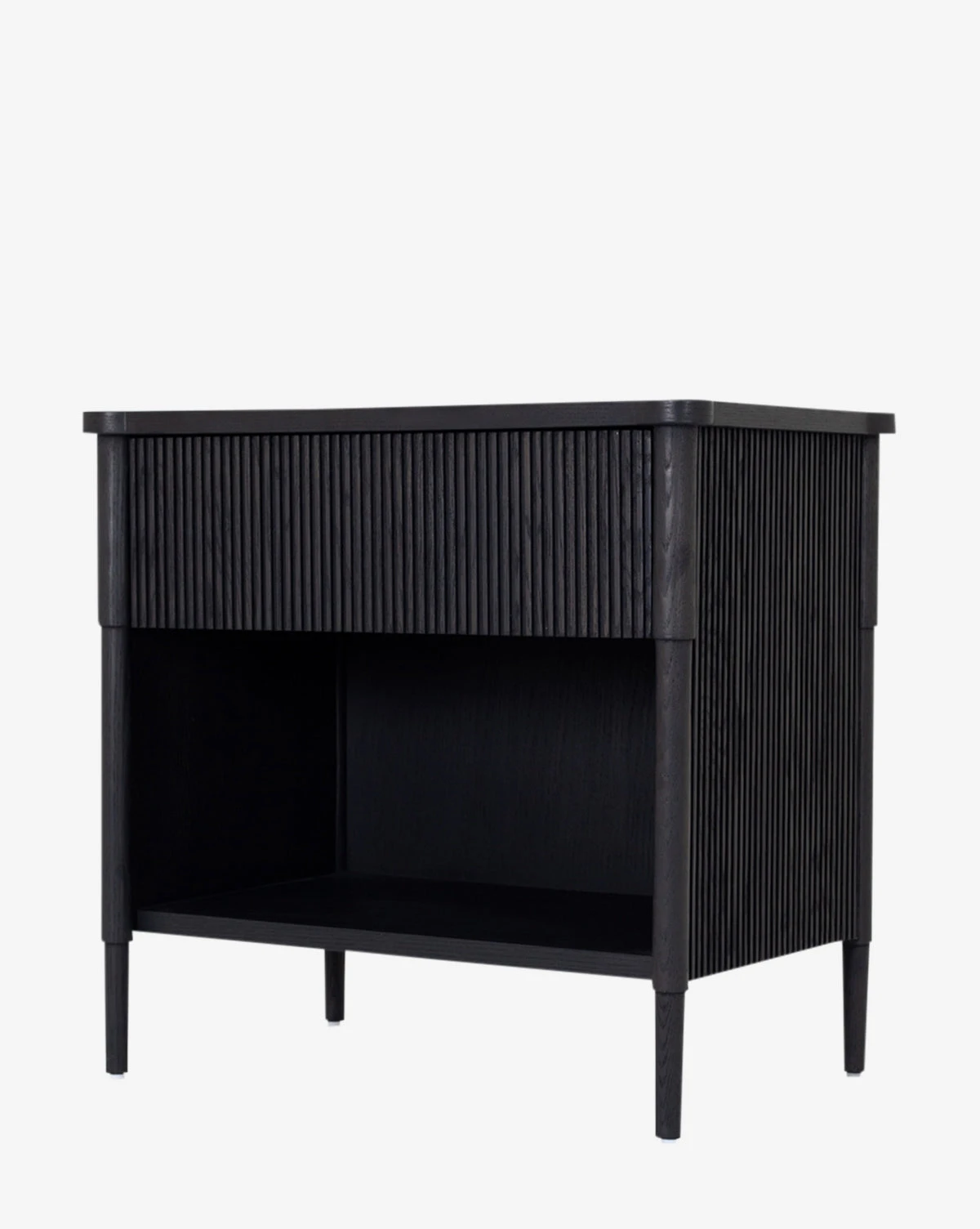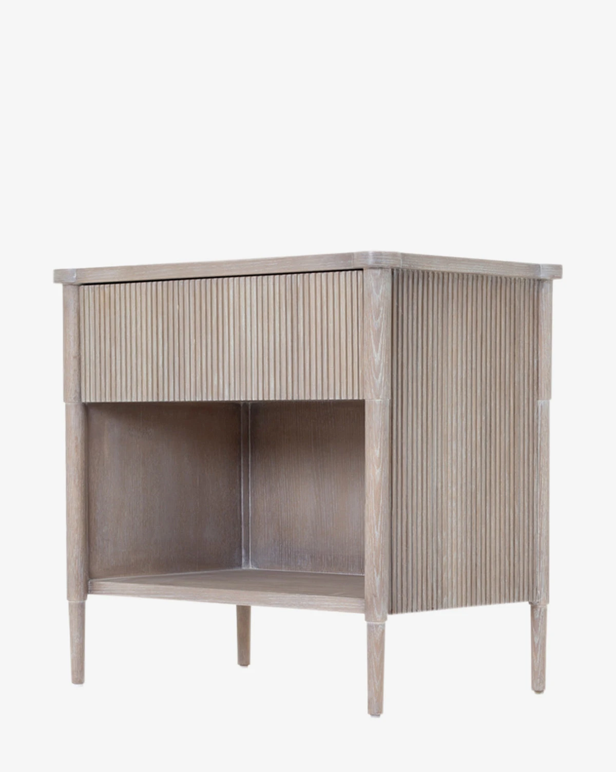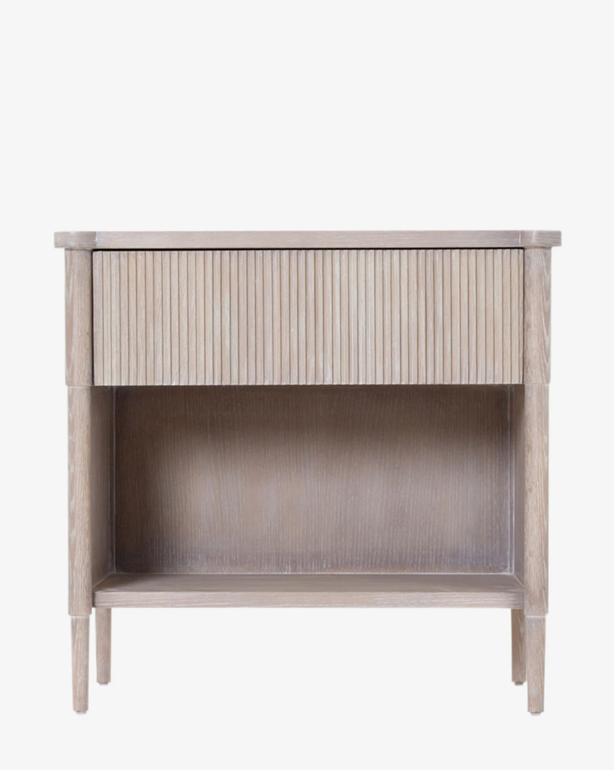 Designed with both function and aesthetic in mind, the Colbert Nightstand is crafted from white oak with reeding detail on the doors. With a soft close drawer and open bottom shelf, the bench-made nightstand elevates and organizes the bedrooms in your home.