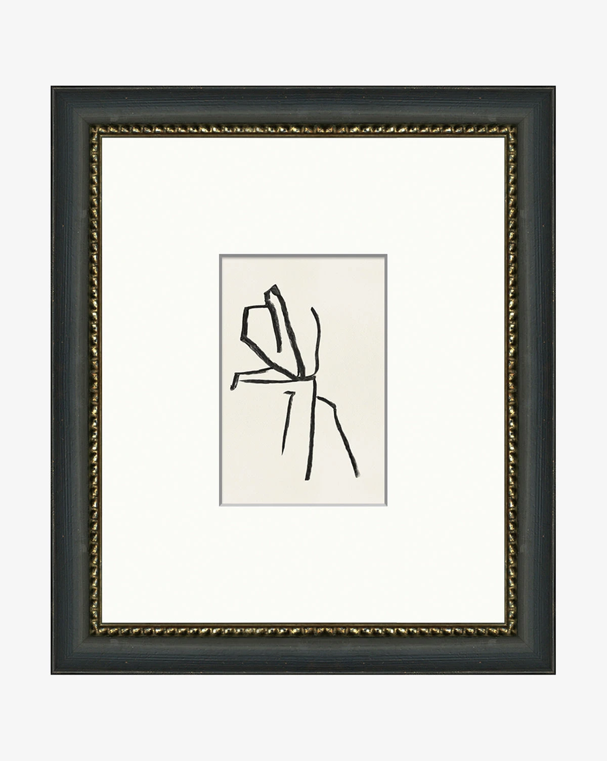 An abstract outline of a posed person, Contemplative Figure is composed of simple black brush strokes. Its composition is captivating, elevating the decor in your space. With a wood frame, the piece is presented with gallery-quality materials.Â
