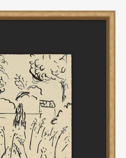 With the feel of a vintage illustration, Courtyard is simple yet captivating. The sketch depicts a plant-filled courtyard, that is warm and inviting in its spaciousness. Deckled and floated on a mat, the piece is framed by gold-finished wood. Â