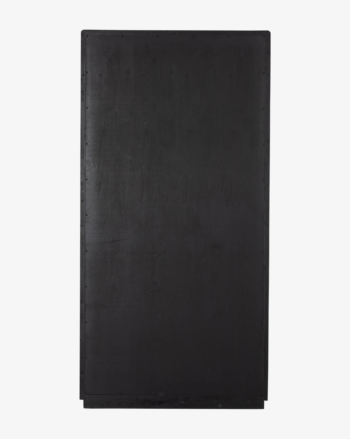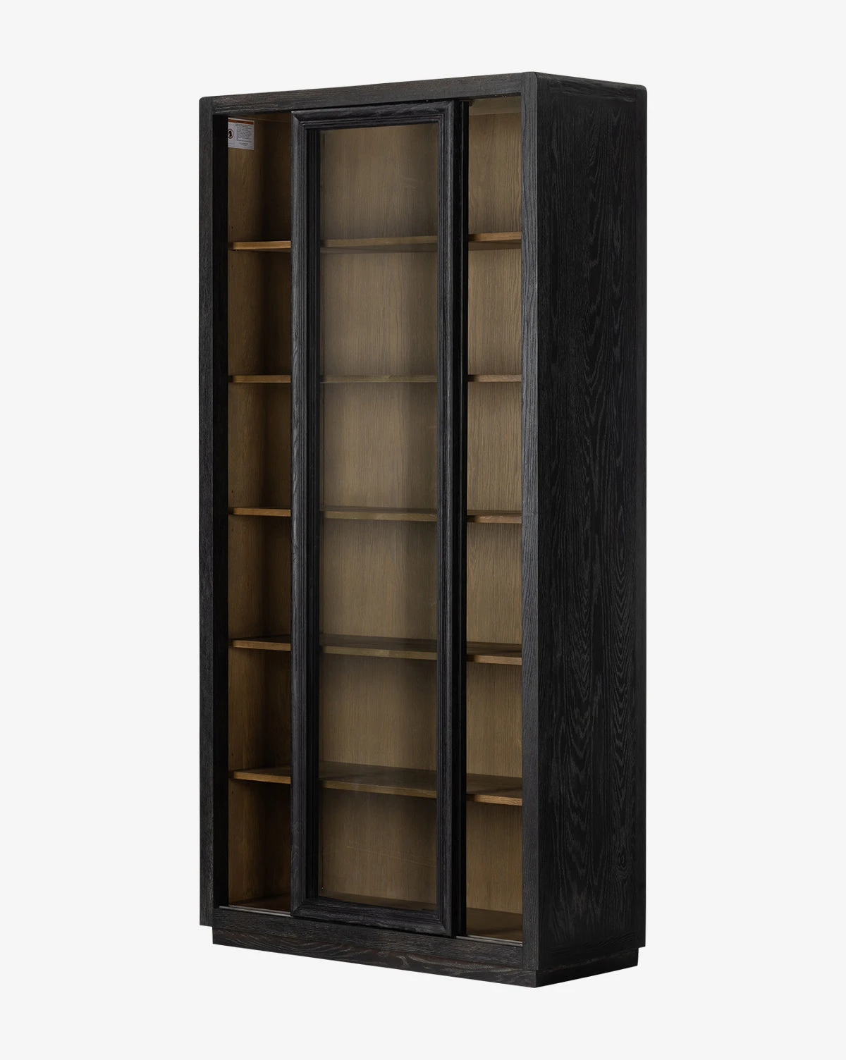Made of distressed black oak, the Cristina Cabinet is sleek in its style and dramatic in its scale. The natural details of the oak bring detail to the dark cabinet while sliding tempered glass doors enclose generous interior shelving.
