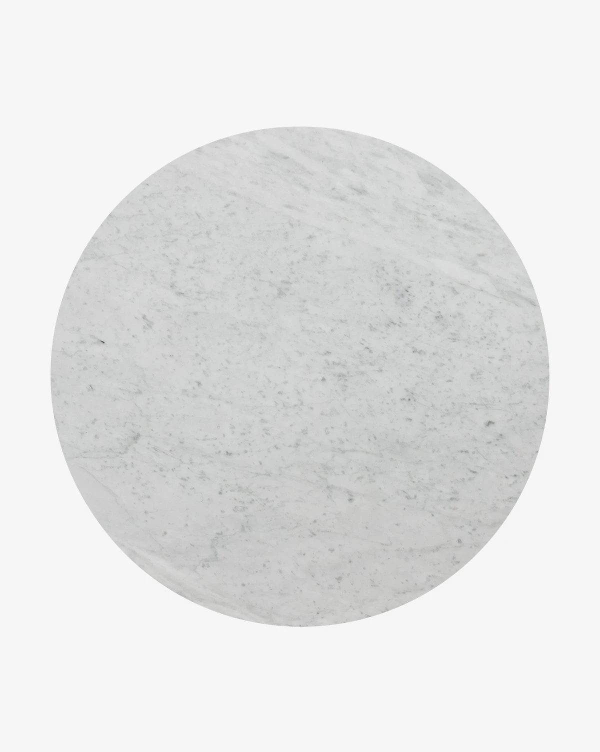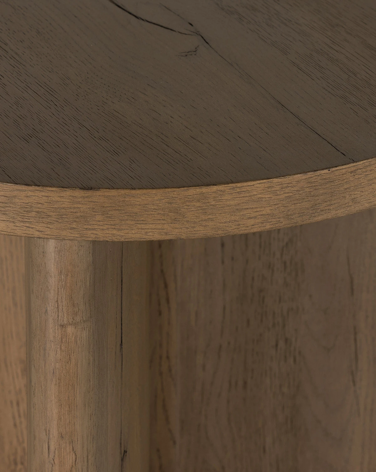 A testament to mixed-material designs, the Damon End Table effortlessly blends wood with marble. Its chunky pedestal base is crafted from thick-cut oak finished in rustic grey, and its rounded tabletop is crafted from white Italian marble.