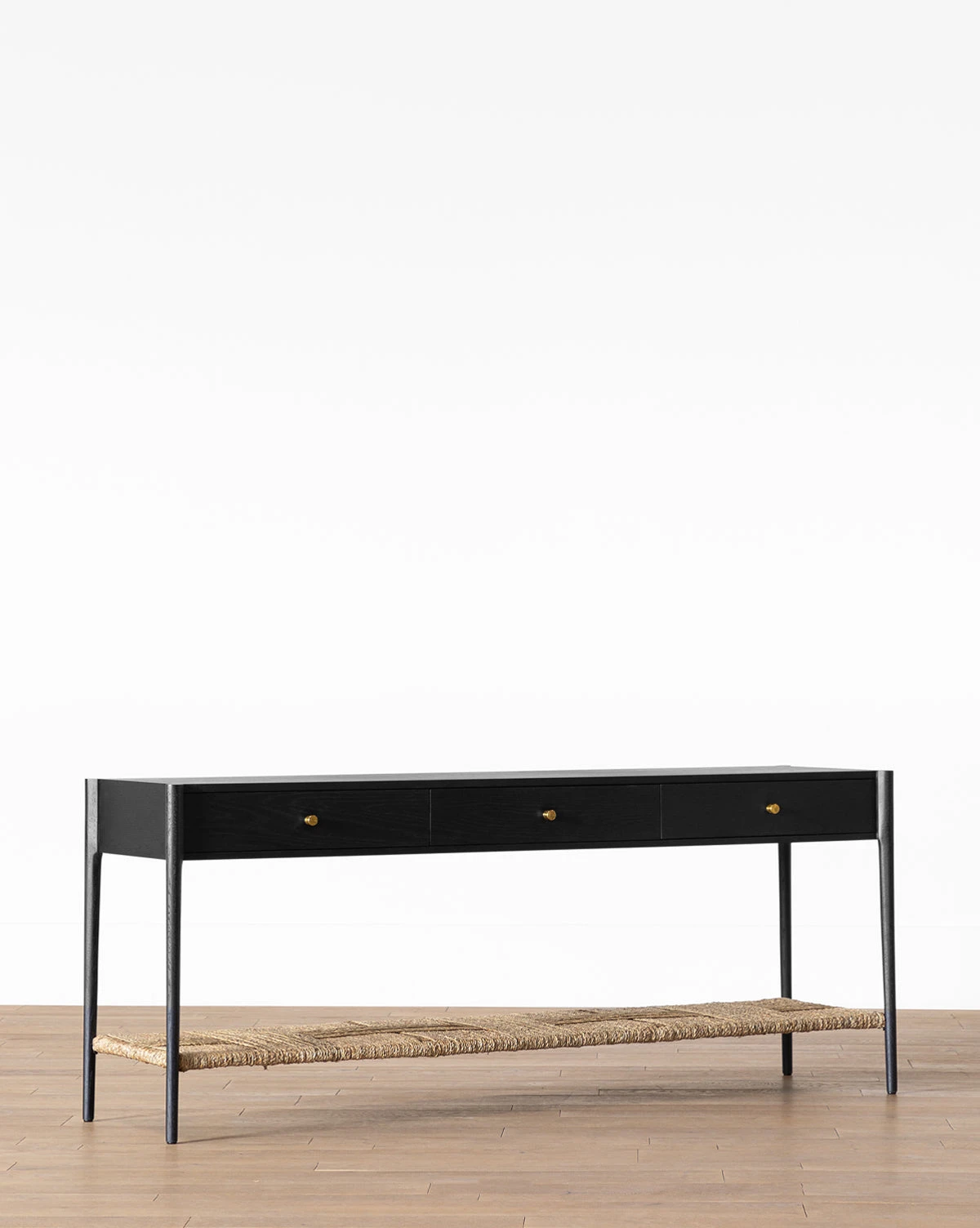 With contrasting materials, the compelling but relaxed Dana Console elevates your space with its thoughtful details. Made from oak in a black finish, the console’s sleek form holds three soft close drawers finished with brass hardware. The woven seagrass shelf provides an open space and a welcome natural texture to your entryway decor.