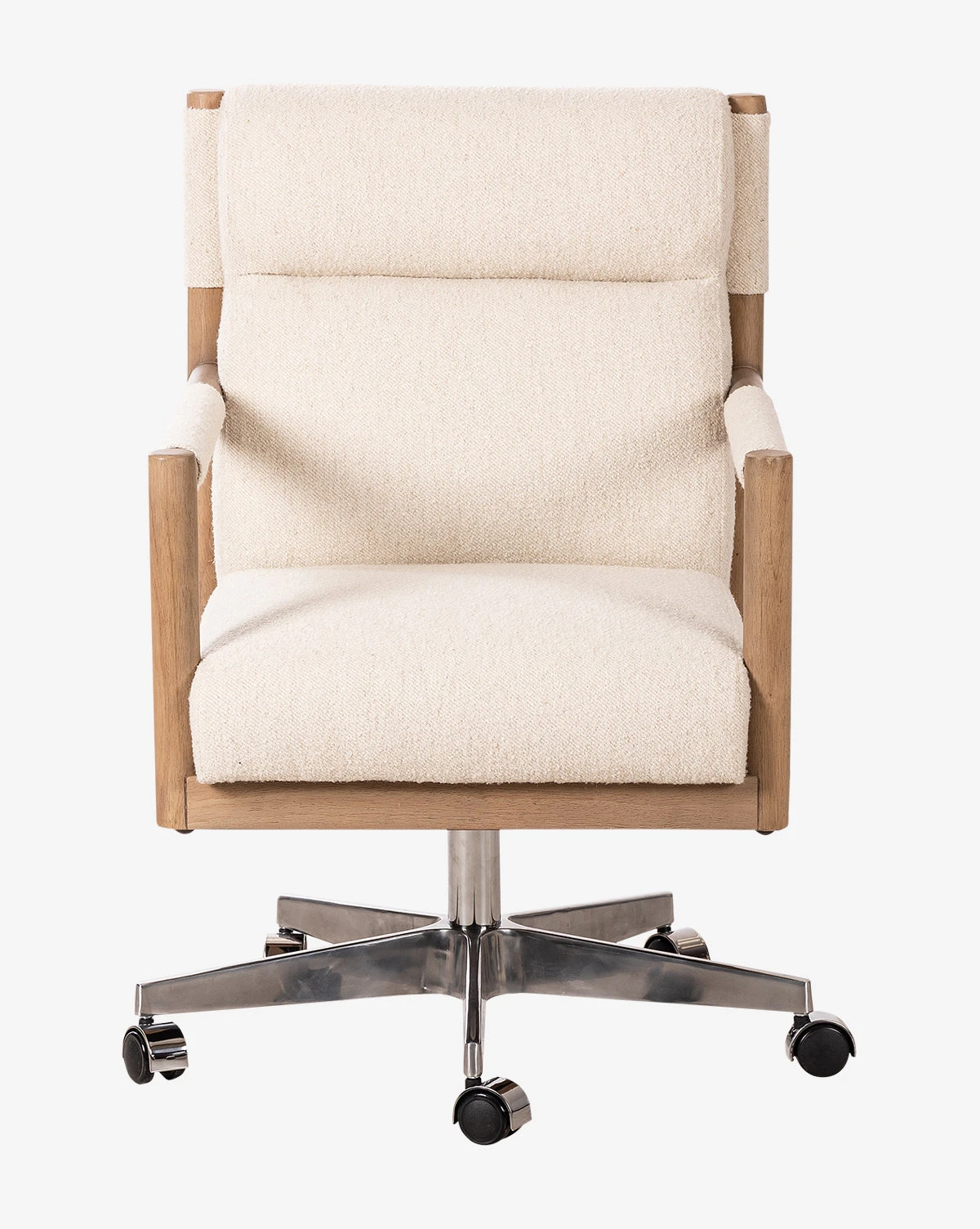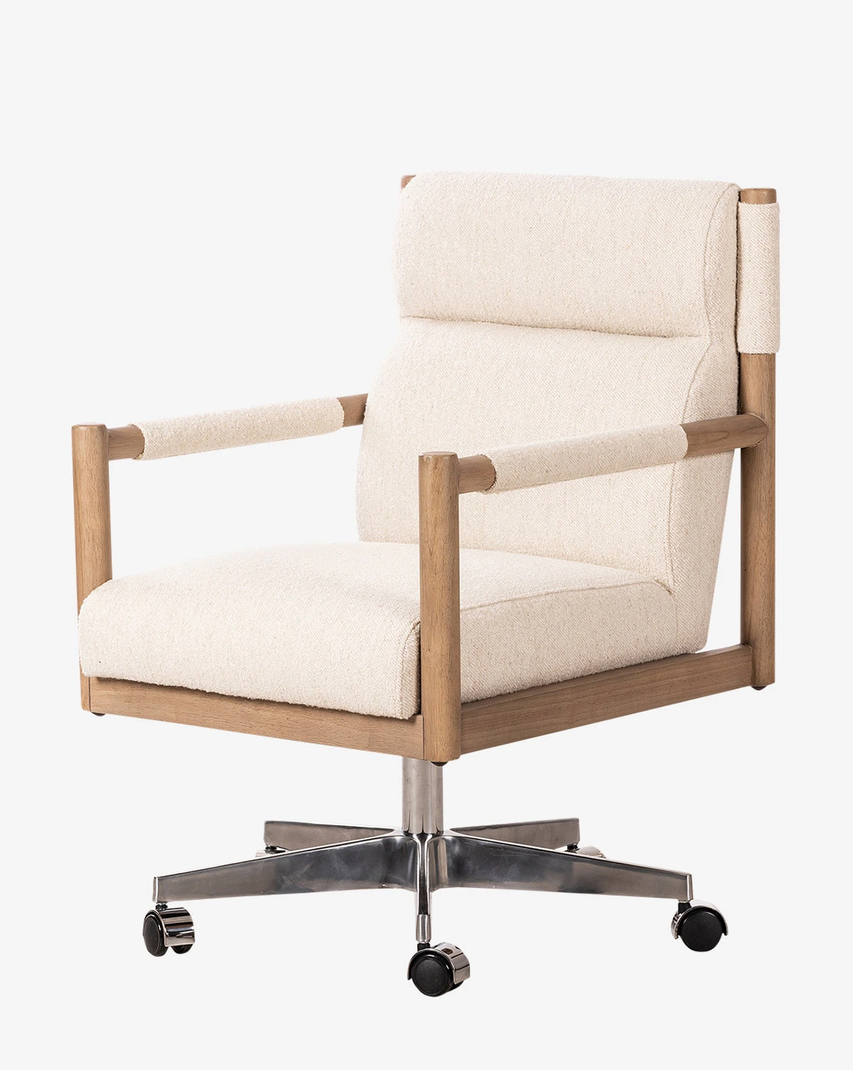 With cushions upholstered in either top grain leather or oatmeal performance fabric, the Darby Desk Chair is elevated and inviting. Its sophisticated mix of materials makes it a unique presence in your space, while wheels and adjustability add functionality to its modern design.