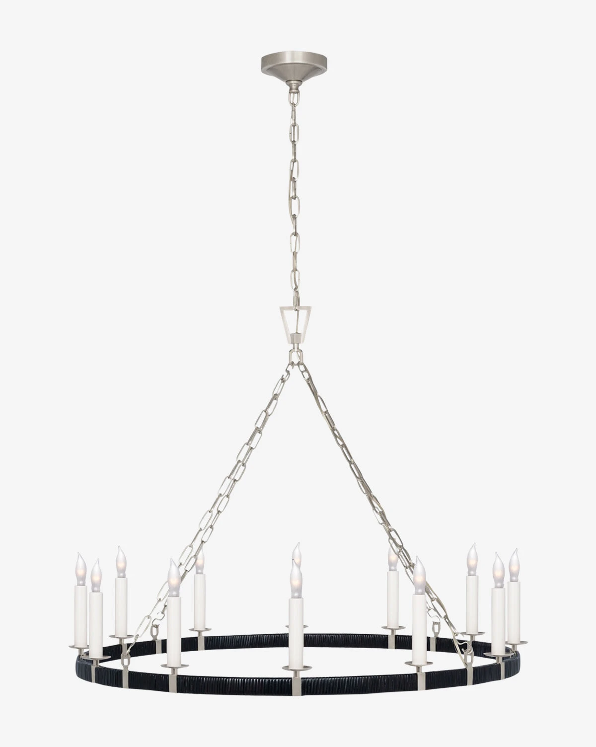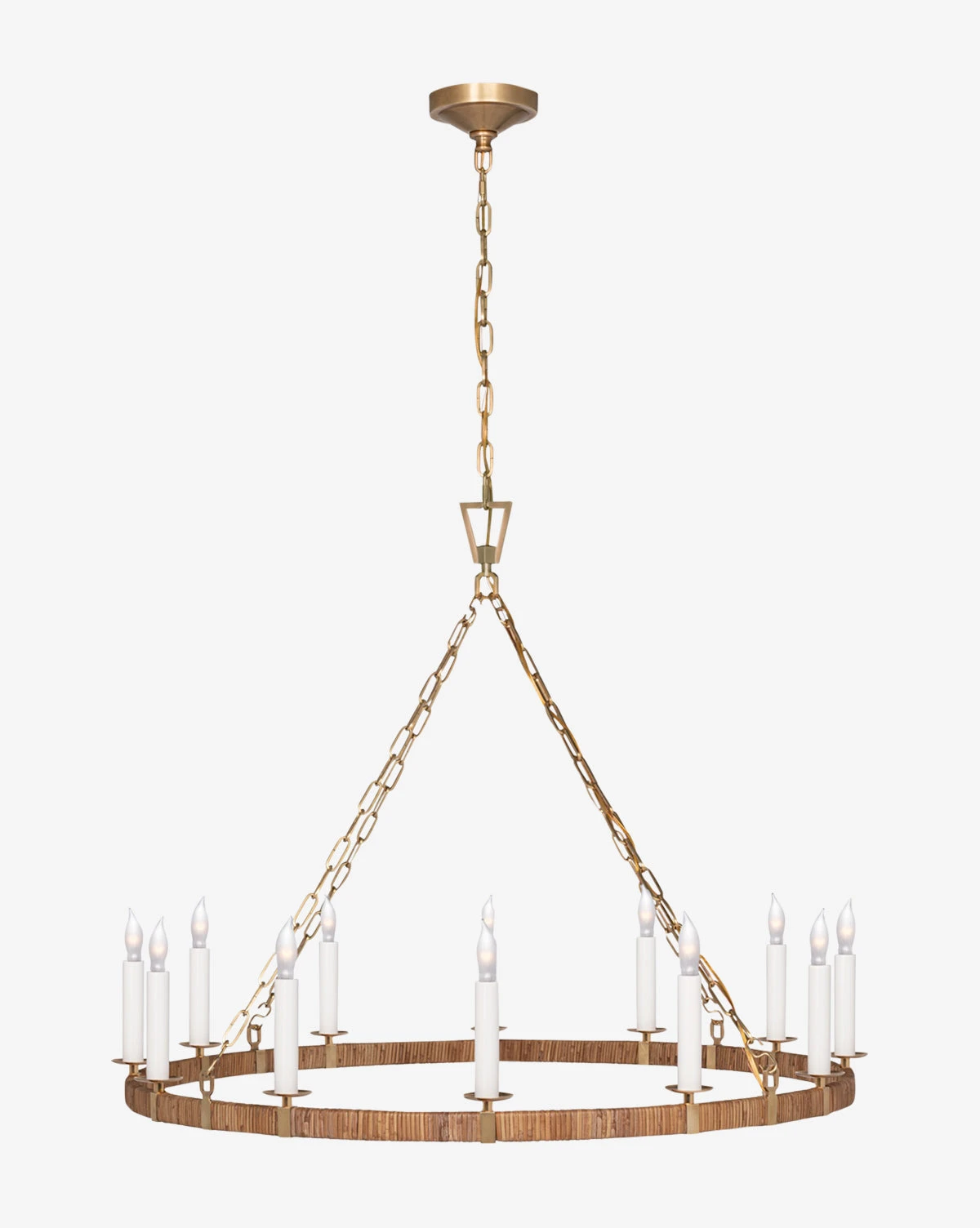 The Darlana Wrapped Chandelier is inspired by the traditional chandelier but given a modern and textural update. Sleek likes and an open frame wrapped in rattan hold candelabra lights, making a contemporary fixture for the entryway, dining, or kitchen area.