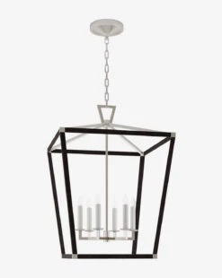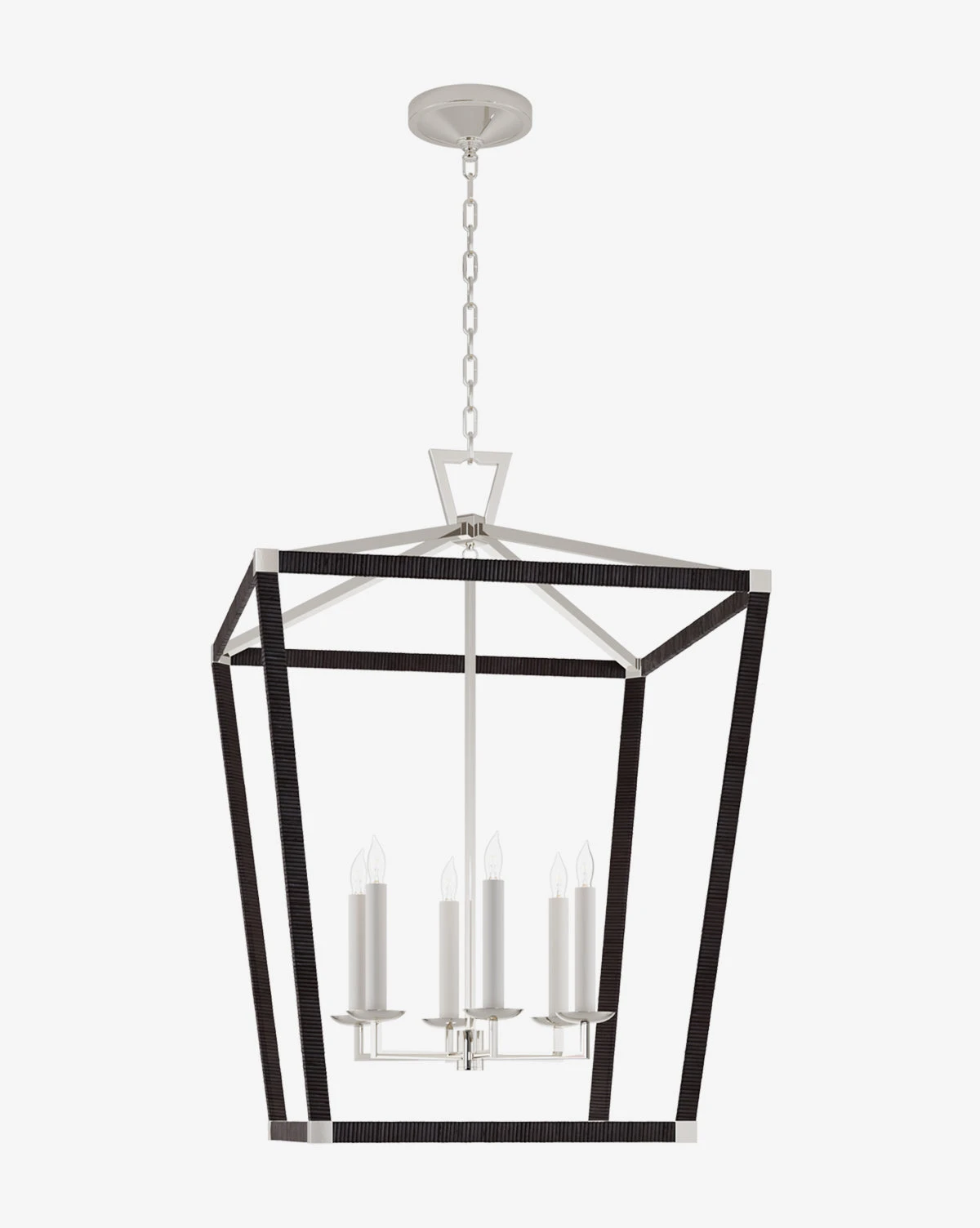 The Darlana Wrapped Lantern is inspired by the traditional lantern but given a modern update. Sleek lines and rattan details, with a suspended candelabra, make for an ideal contemporary pendant for the entryway, dining, or kitchen area.