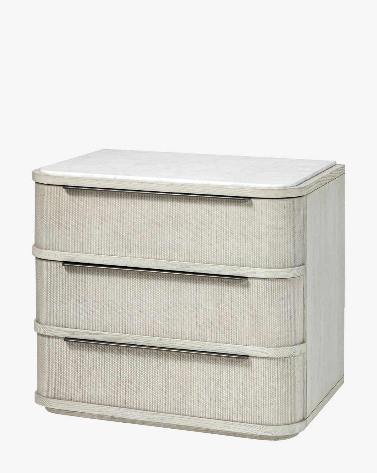 With elegantly mixed materials, the compelling yet neutral Deirdre Chest elevates your home with its thoughtful details. Made from whitewashed wood with caning on the drawers, the chest’s marble top brings sleek and sophisticated texture to the piece.