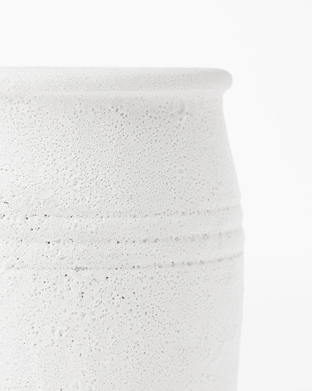 Our Distressed Chalk Glaze Crock draws the eye with antique-inspired details. From the subtle 3 lined detail, to the rounded rim, its imperfect terracotta form brings depth and dimension while holding all your everyday kitchen tools.