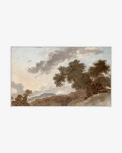 Subdued and rich, Dusk is painted in a tone-on-tone palette with a soft touch of blue. Its casual brush strokes are intentional and faded, illuminating the scene of dusky mountains with a sense of mist and crisp air. The clouds and trees gently move the viewer through the piece with casual direction, adding a sense of calm to galleries and vignettes. Â