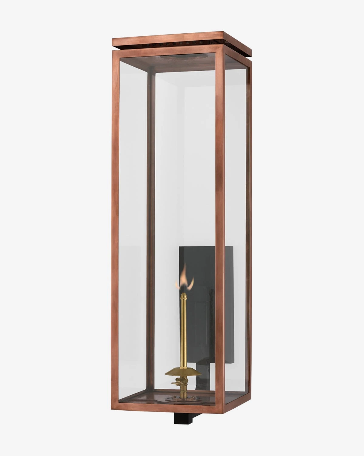A romantic take on modern simplicity, the Fresno Outdoor Wall Lantern elevates your outdoor space with the welcoming warmth of its single burning flame. Its geometric construction is made of copper, complementing your home exterior with classic refinement.