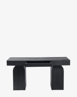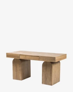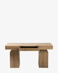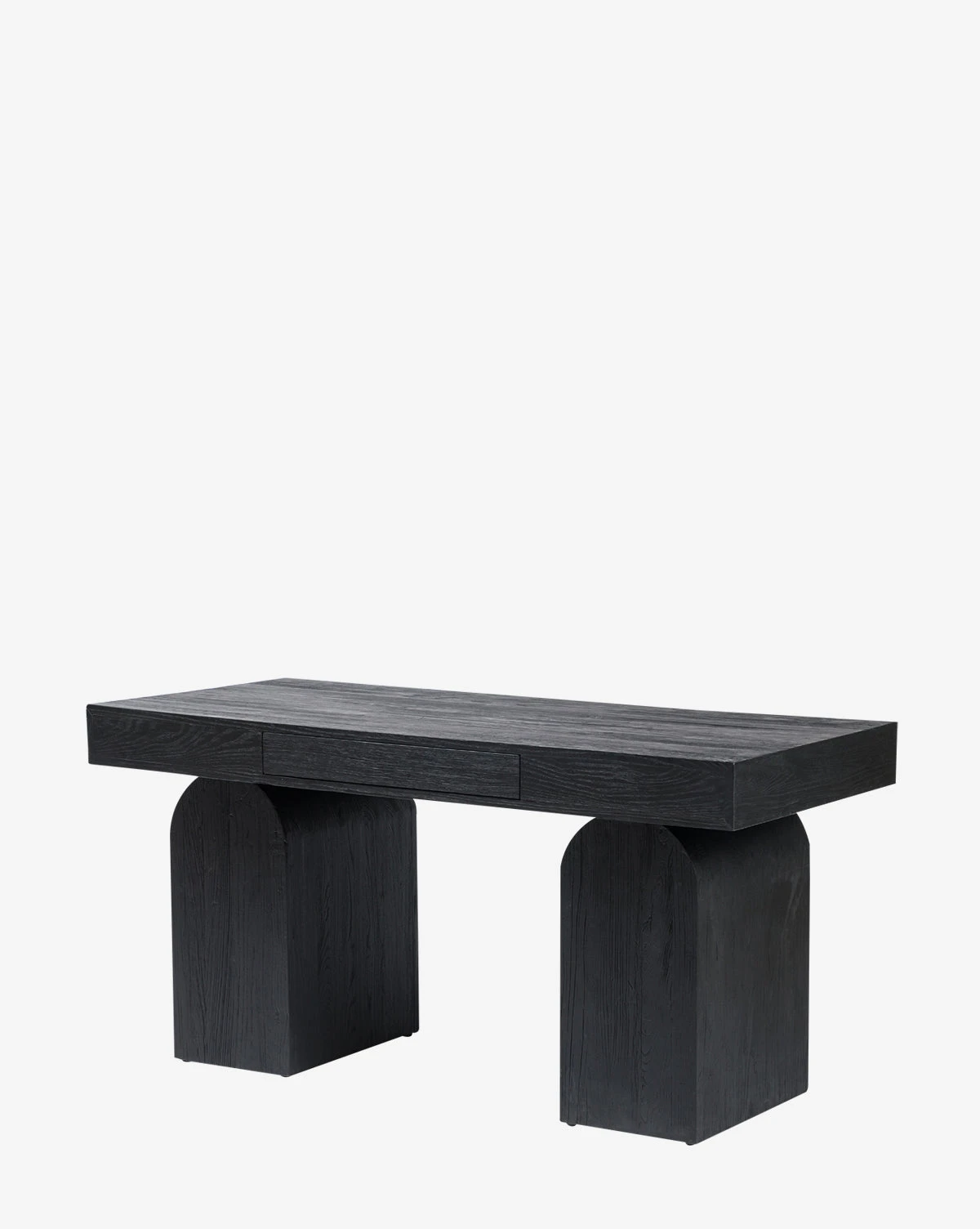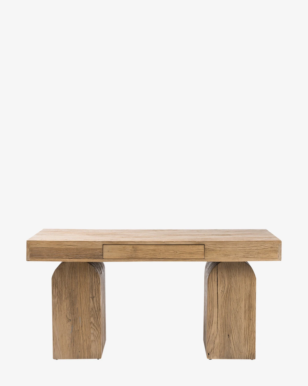 Shapely and bold, the Fuller Desk studies scale and shape with its heavy, arched legs. Crafted from reclaimed elm, the desk is visibly knotted with natural grain and finished in two unique colorways. This sculptural piece is given practical function with a single, spacious drawer, and its broad surface area and finished backing allows you to use it for any purpose, in any space.