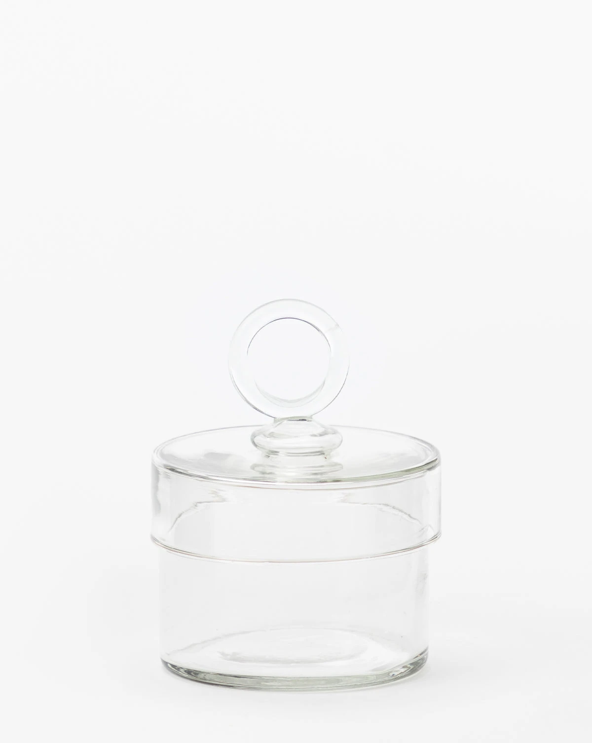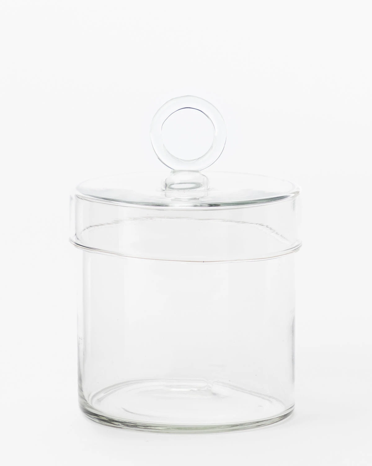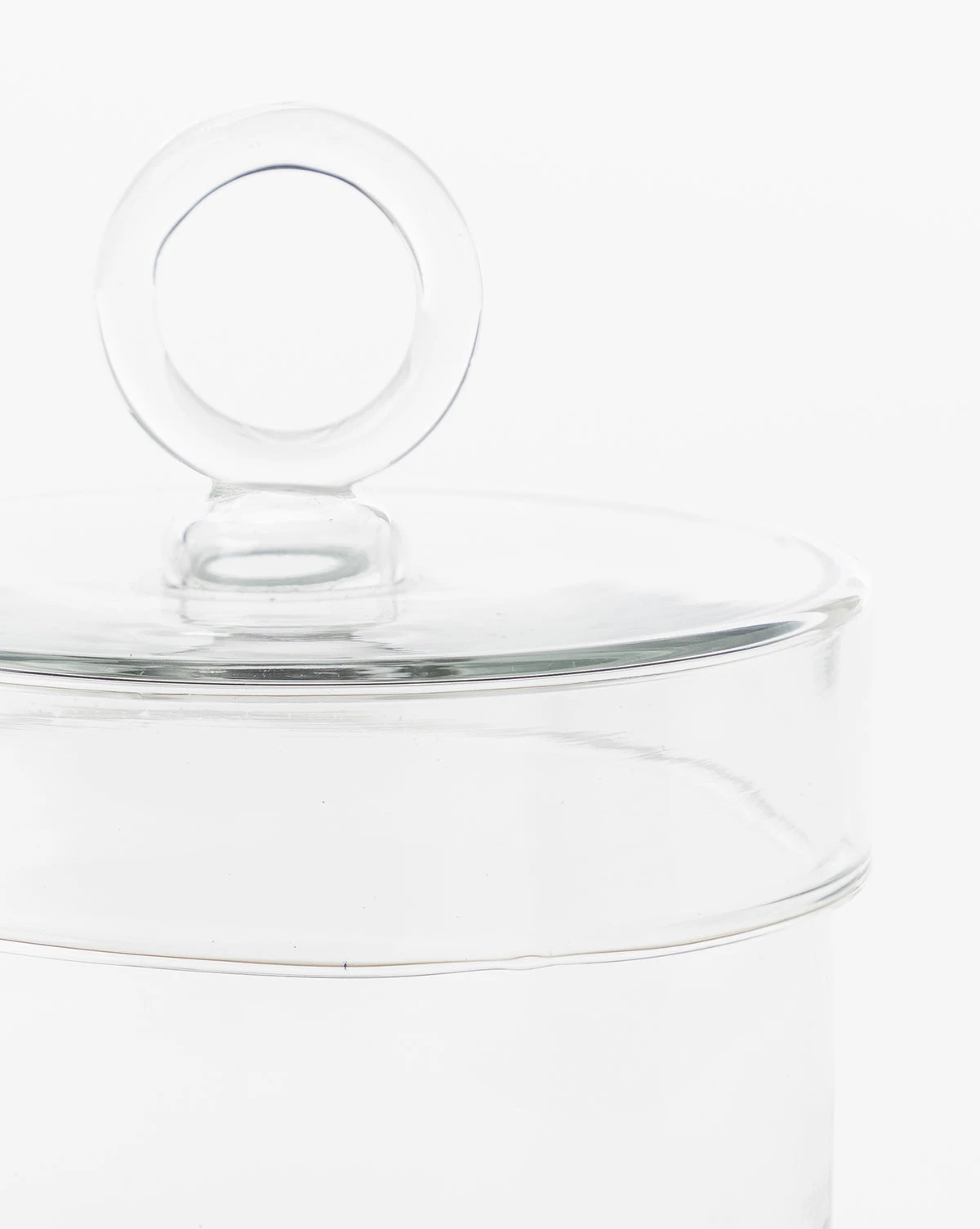 With a classic round shape and bold lid, the Glass Lidded Canister is ideal for your bathroom countertop or shelves. Its unique round handle is a subtle modern detail that creates a balanced aesthetic in any use.