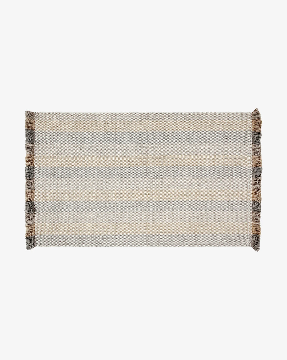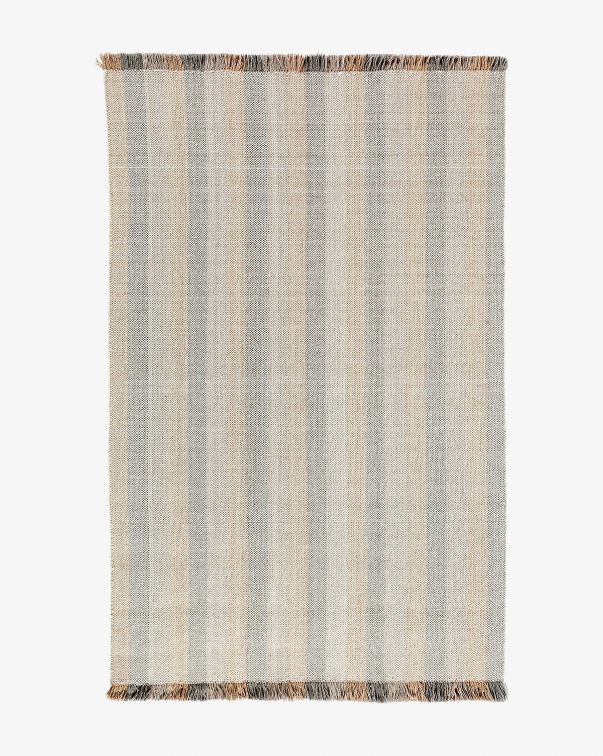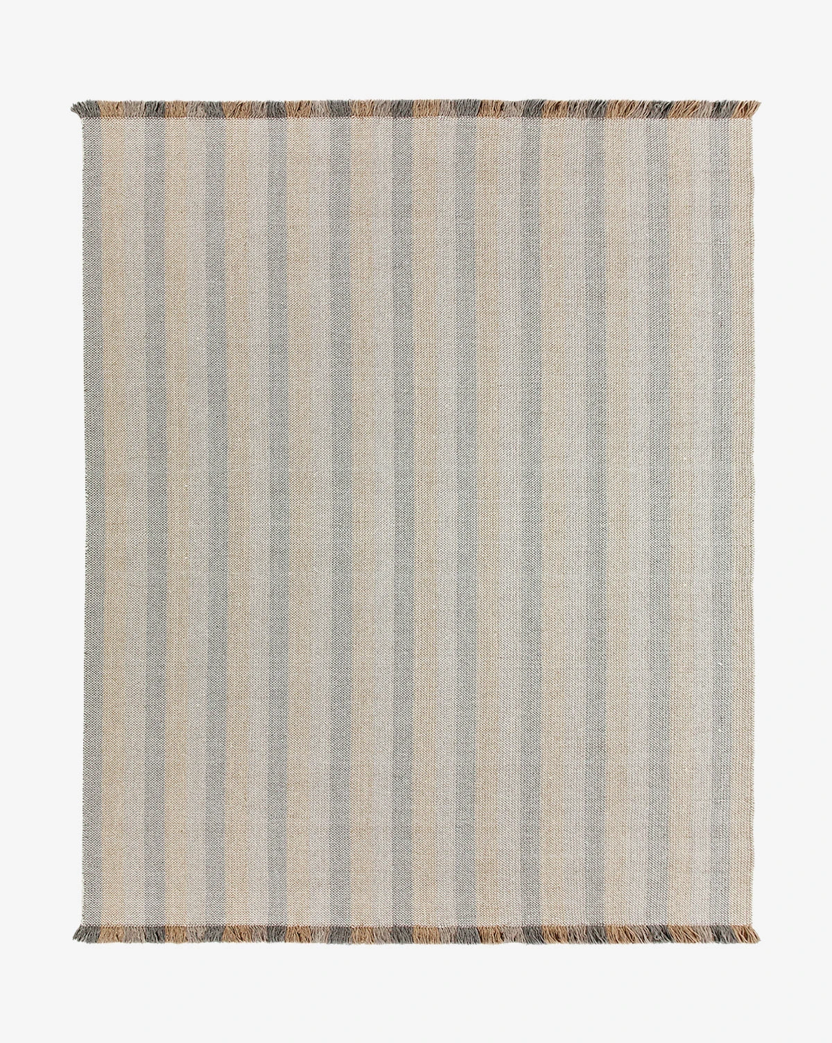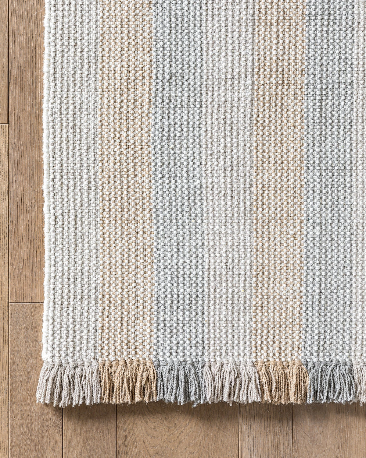 Contrasted tones bring a playful quality to our eclectic Grandby Handwoven Wool Rug. In hazy, muted hues of rose, beige, and gray-toned brown, the rug itself has a handwoven striped design with fringe that extends this pattern in brighter, richer tones of the same palette.ย