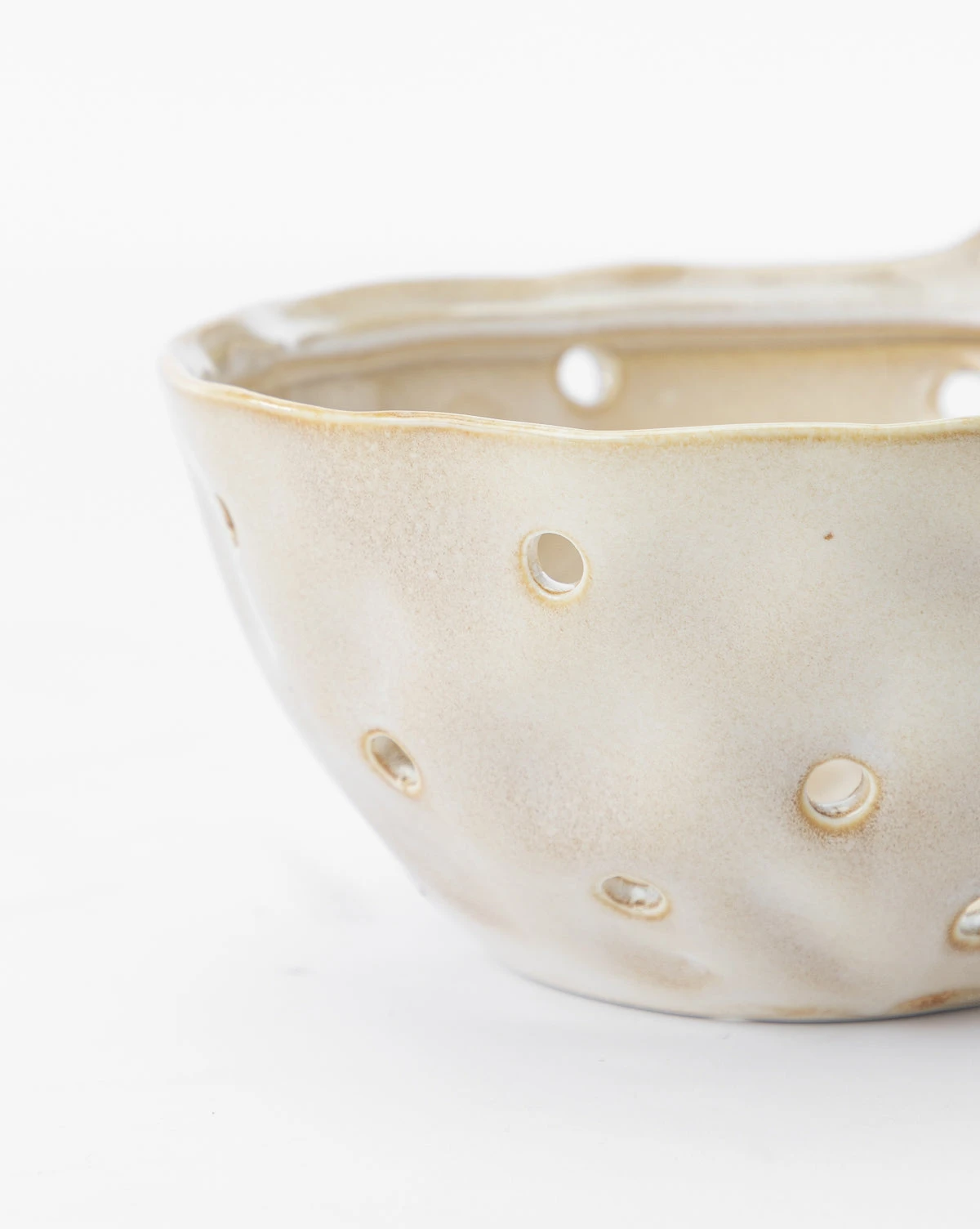 With a rustic finish and clever sculpted handle, the Handled Stoneware Berry Bowl has an organic look that both relaxes and elevates kitchen styling. Its intentional pattern and warm neutral coloring bring attention to its organic design, emphasizing the natural feel of this whimsical bowl.