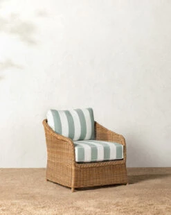 Crafted from woven wicker around an elegant metal frame, the Haviland Outdoor Lounge Chair with Striped Cushions offers organic aesthetic and weather resistance to outdoor lounging. Complete with a boxed seat cushion and a knife edged back cushion, we designed this lounge chair to bring enduring comfort and beauty to your outdoor spaces.