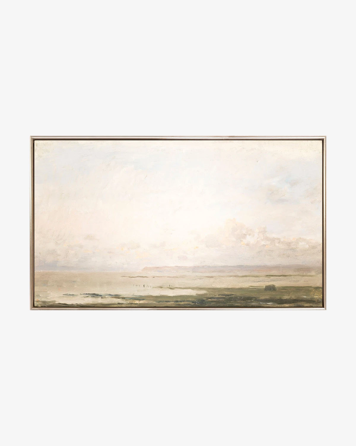 Soft brushstrokes of blush and olive create the serene scene of our Hazy Beach piece. Quintessential clouds in the distance play with depth and dimension through a masterful use of color.