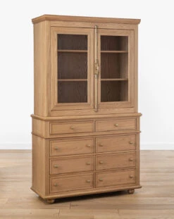 With a traditional design, our Heath Oak Cabinet is stately and elegant. This oak cabinet was crafted with a keen attention to detail, featuring keyholes and round pulls on the drawers and beautiful glass doors enclosing three shelves. The bun feet also add a charming detail to this large oak cabinet.