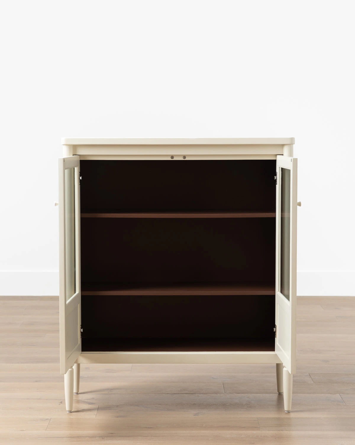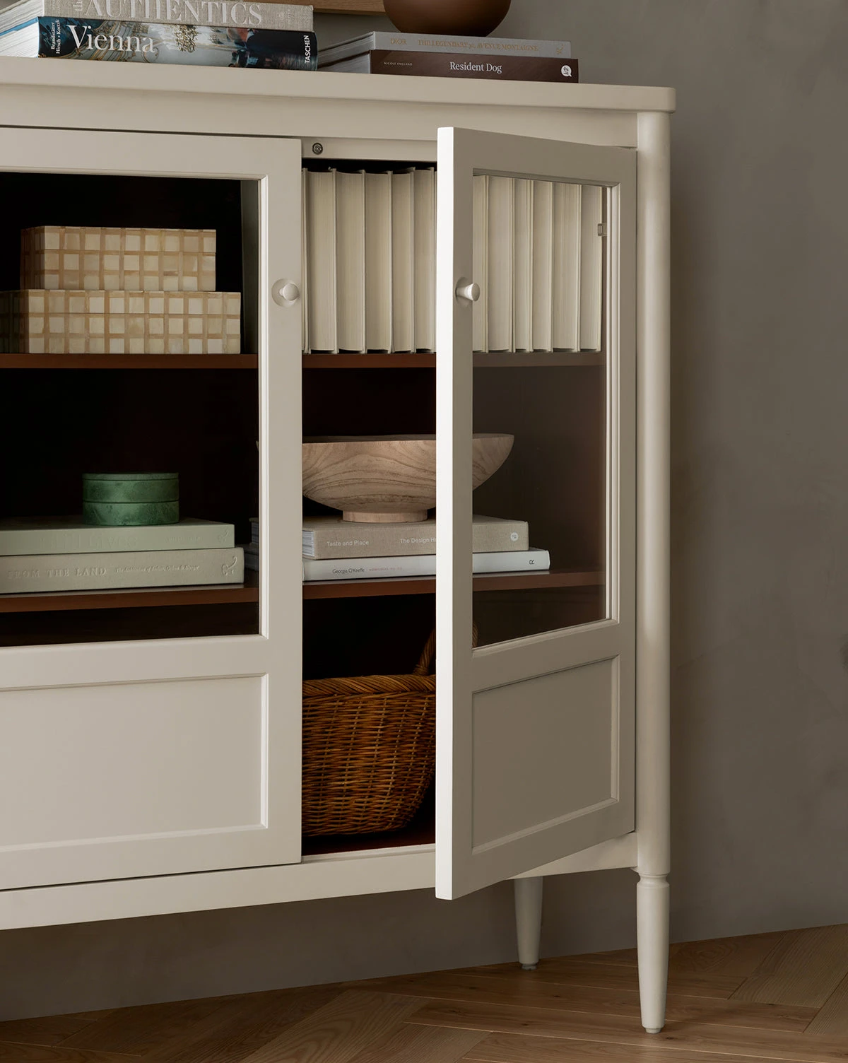 Elevate your dining or living room with the classic form of the Highgate Cabinet. Inspired by Victorian furniture in shape and style, the cabinet is finished in bone white in contrast to the rich brown interior. Glass doors open to spacious shelves for a practical function while inset details and tapered legs bring the elegant nuances of its Victorian furniture inspiration to your decor.