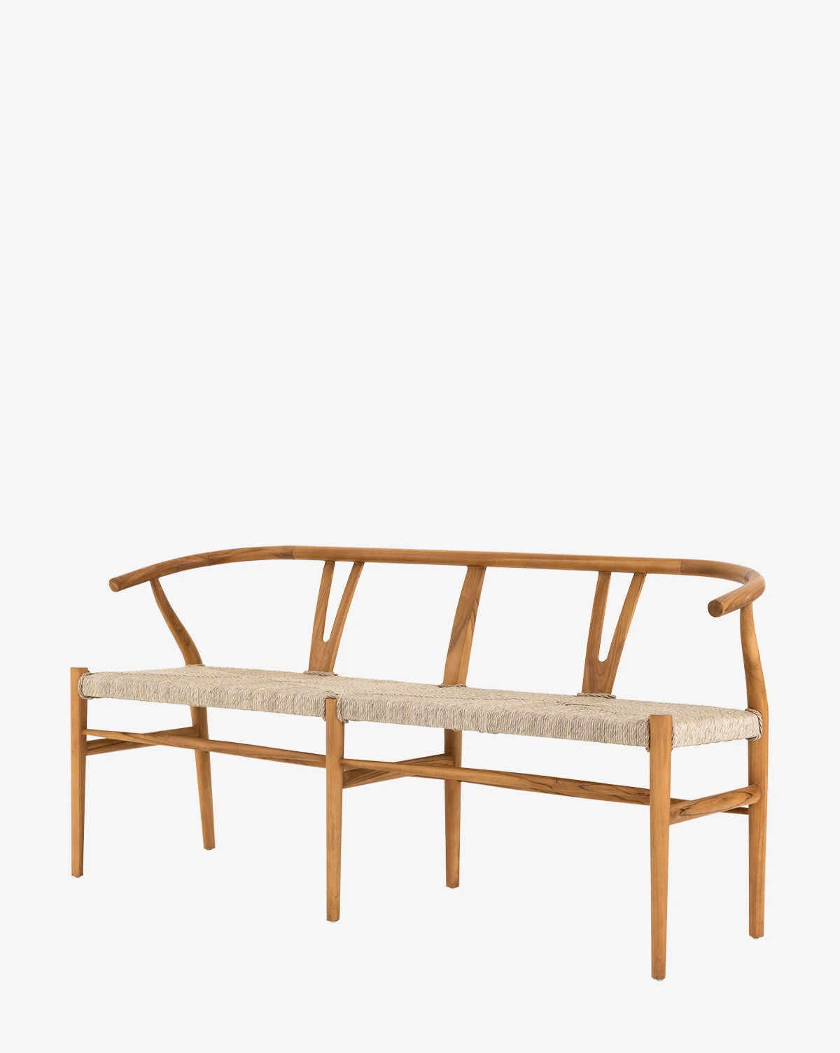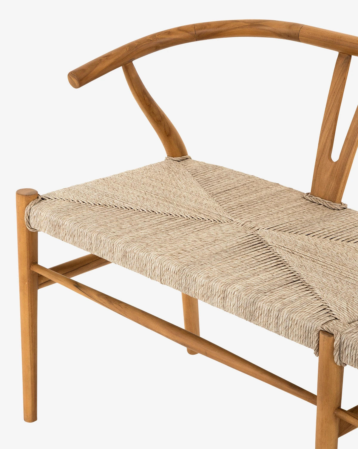 Our Jasper Indoor/Outdoor Bench’s modern wishbone back is set on traditional framing. With a classic natural teak finish pairing effortlessly with its vintage white all-weather wicker, this bench lends a rustic quality to your space that is especially charming.