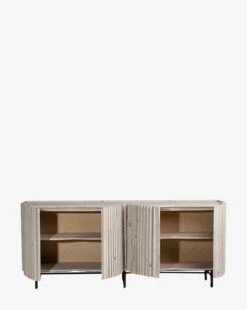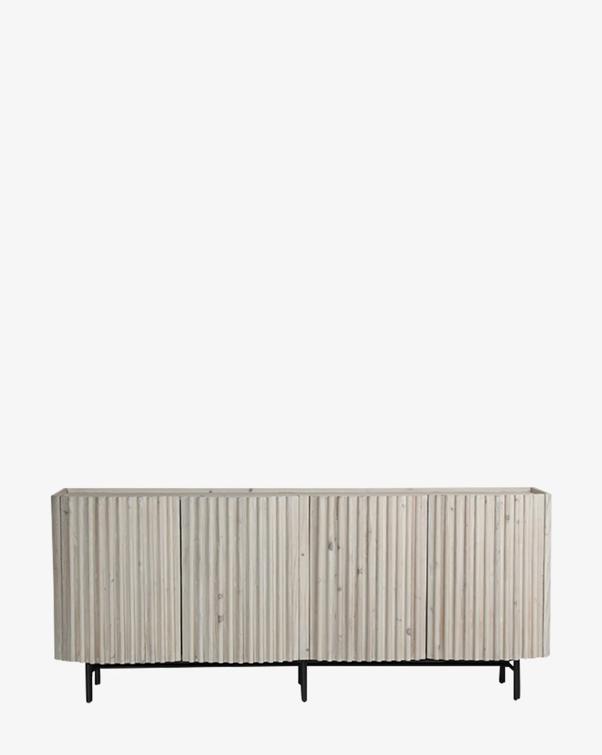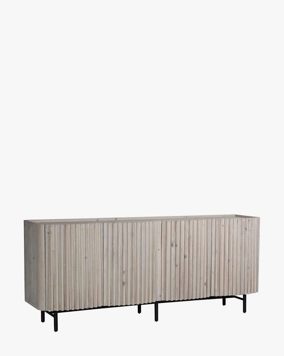 With a blend of modern and organic elements, the Joan sideboard brings visual intricacy to your spaces. The light gray wash finish complements the matte black iron base in a thoughtful mix of materials. The sideboard includes interior shelves that make it as functional as it is beautiful. Â