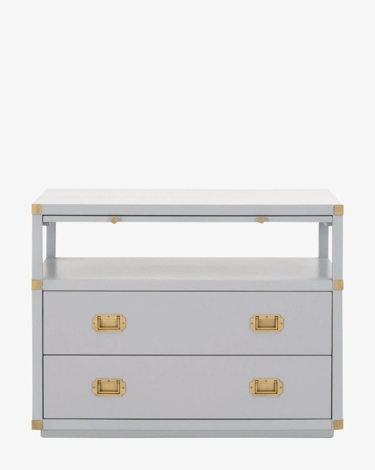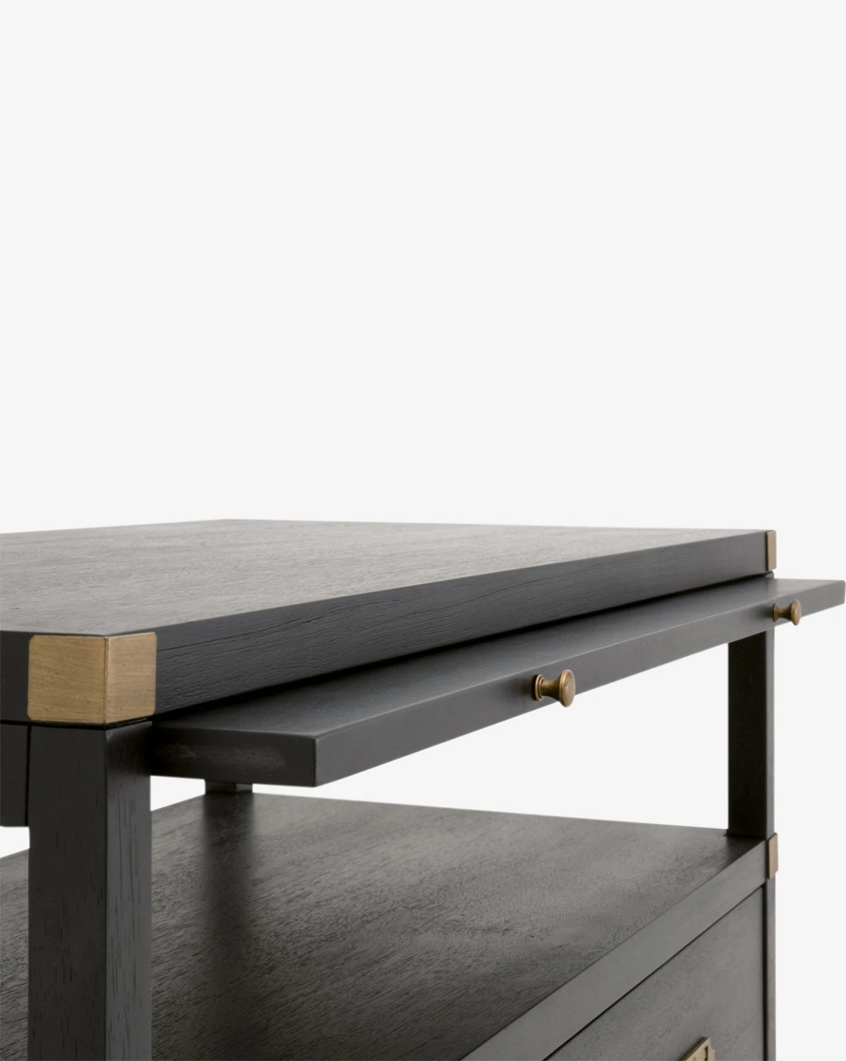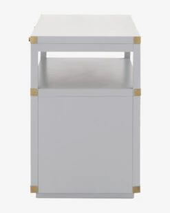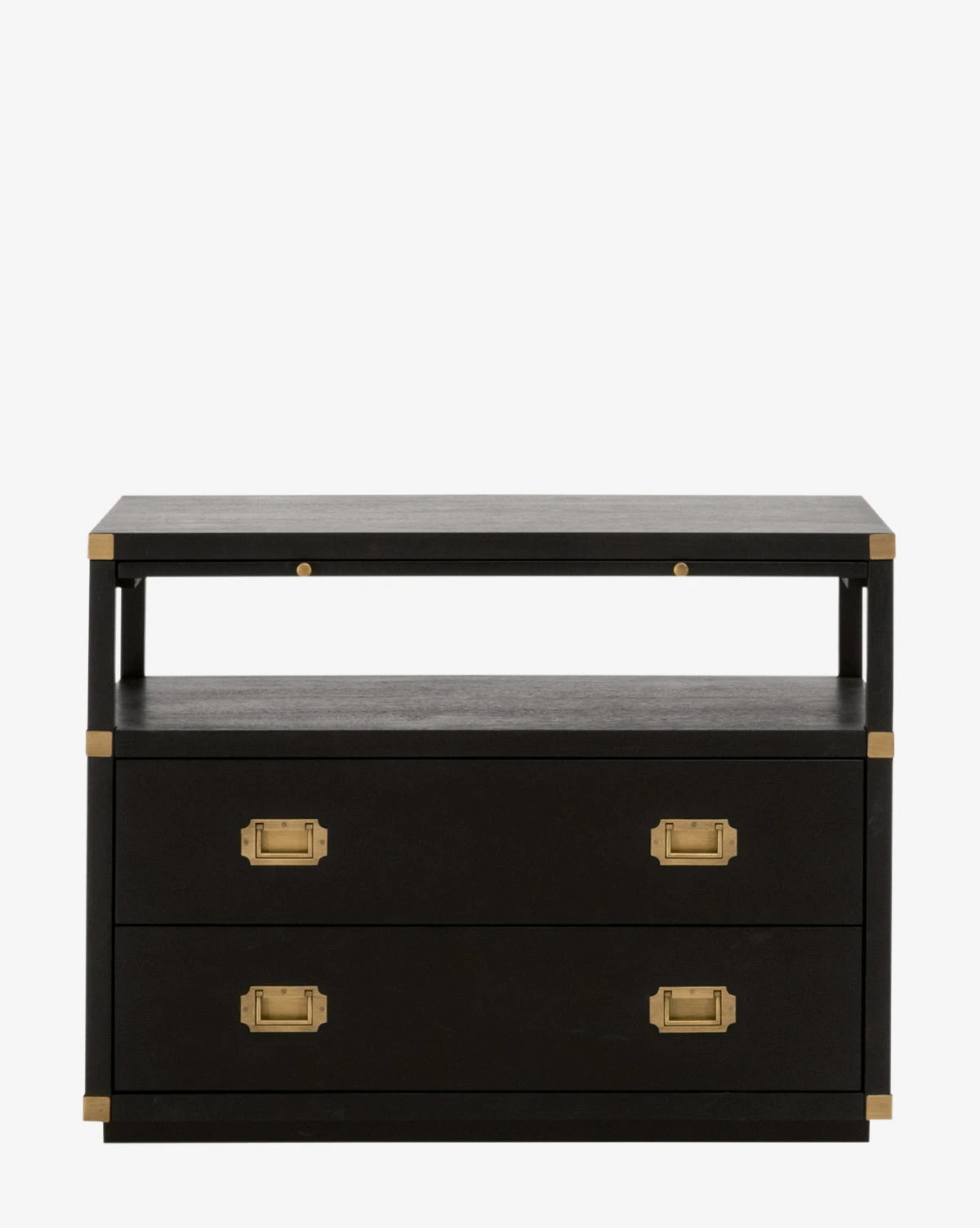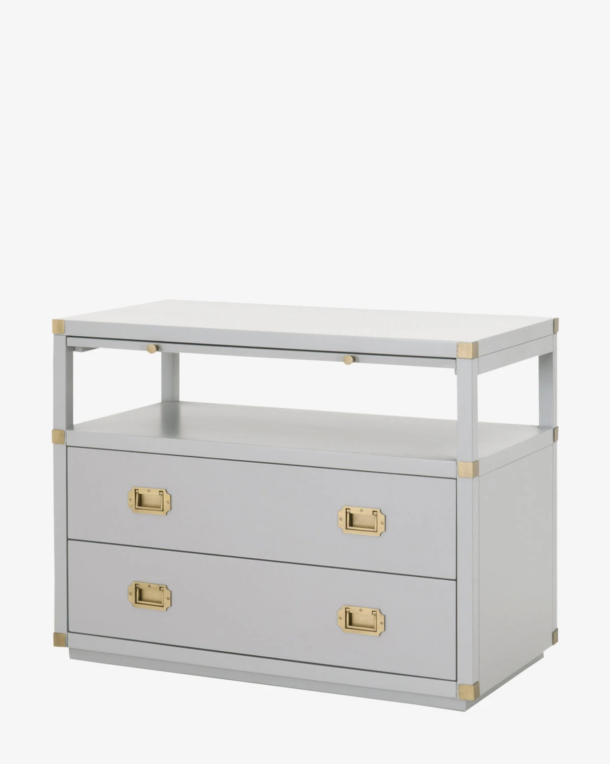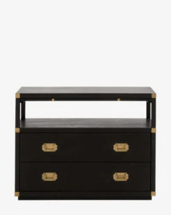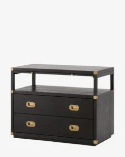 A creamy gray or rich black hue and complementing brass accents combine to bring updated traditional style to your space with our Kelan 2-Drawer Nightstand. With plenty of storage, and a pull-out shelf, this nightstand lends glamorous function and versatility to your bedroom design.Â