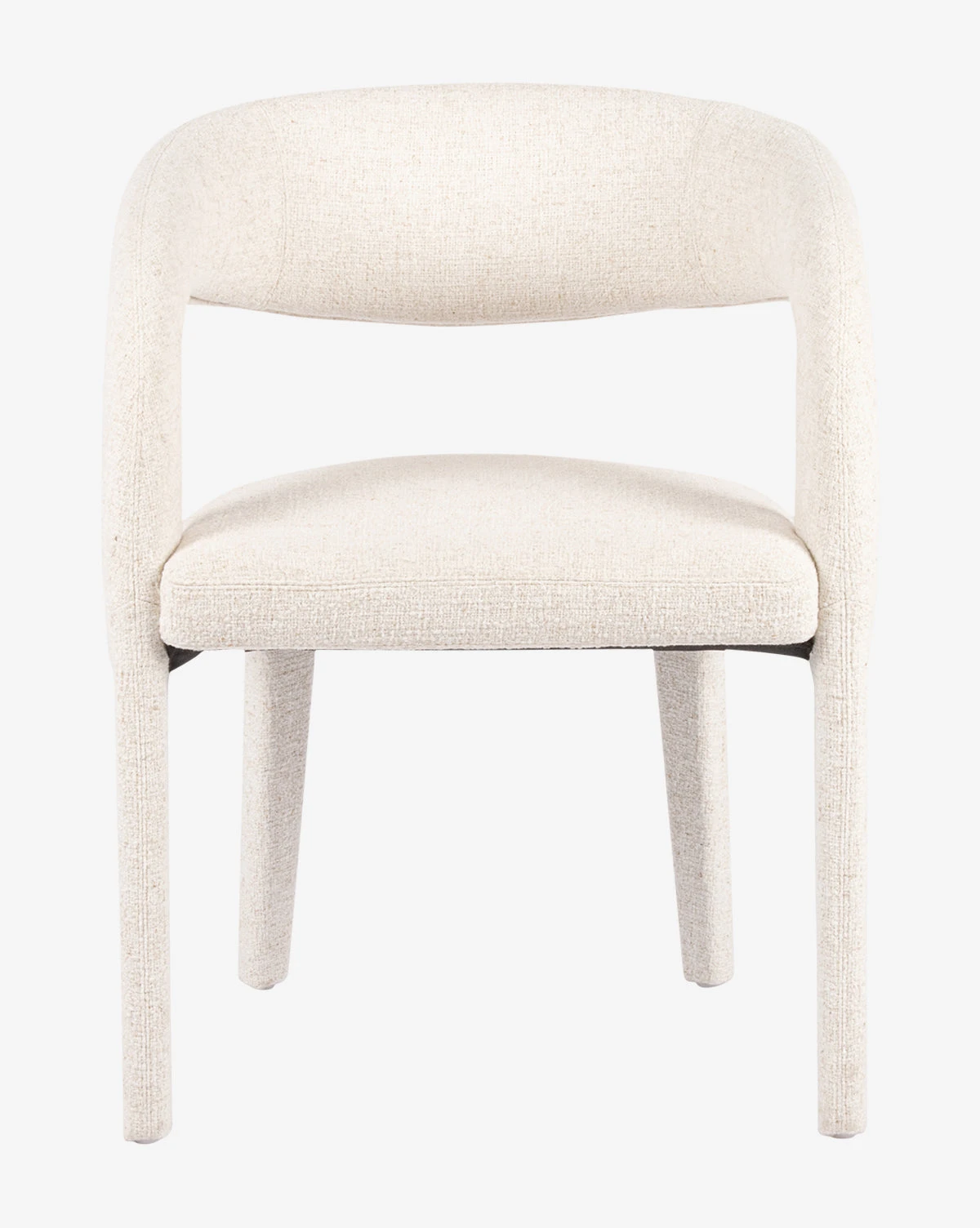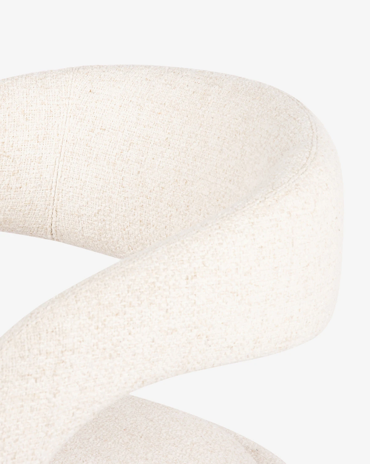 A charming, modern update on a traditional chair, the Kellan Chair has a sculptural design. Its curved frame is upholstered in high-performance, off-white fabric, allowing the eye to focus on the beautiful architecture of the piece.