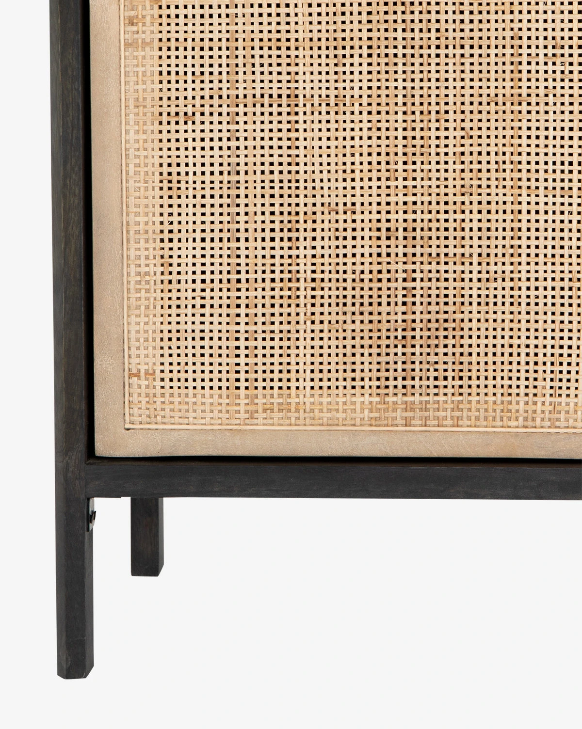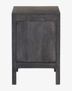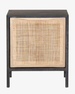 Crafted from solid mango wood, the Kenan Black Nightstand beautifully mixes materials in a simple design. Subtle details elevate the presence of this nightstand, with the black-washed, smooth frame contrasted by the inset woven cane on the door.