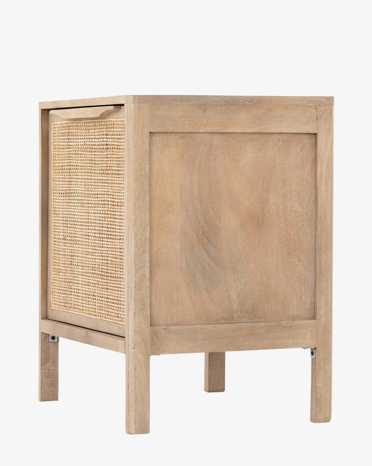 Crafted from solid mango wood, the Kenan Natural Nightstand beautifully mixes materials in a simple design. Subtle details elevate the presence of this nightstand, with the smooth frame contrasted by the inset woven cane on the door.
