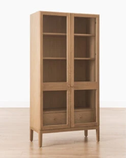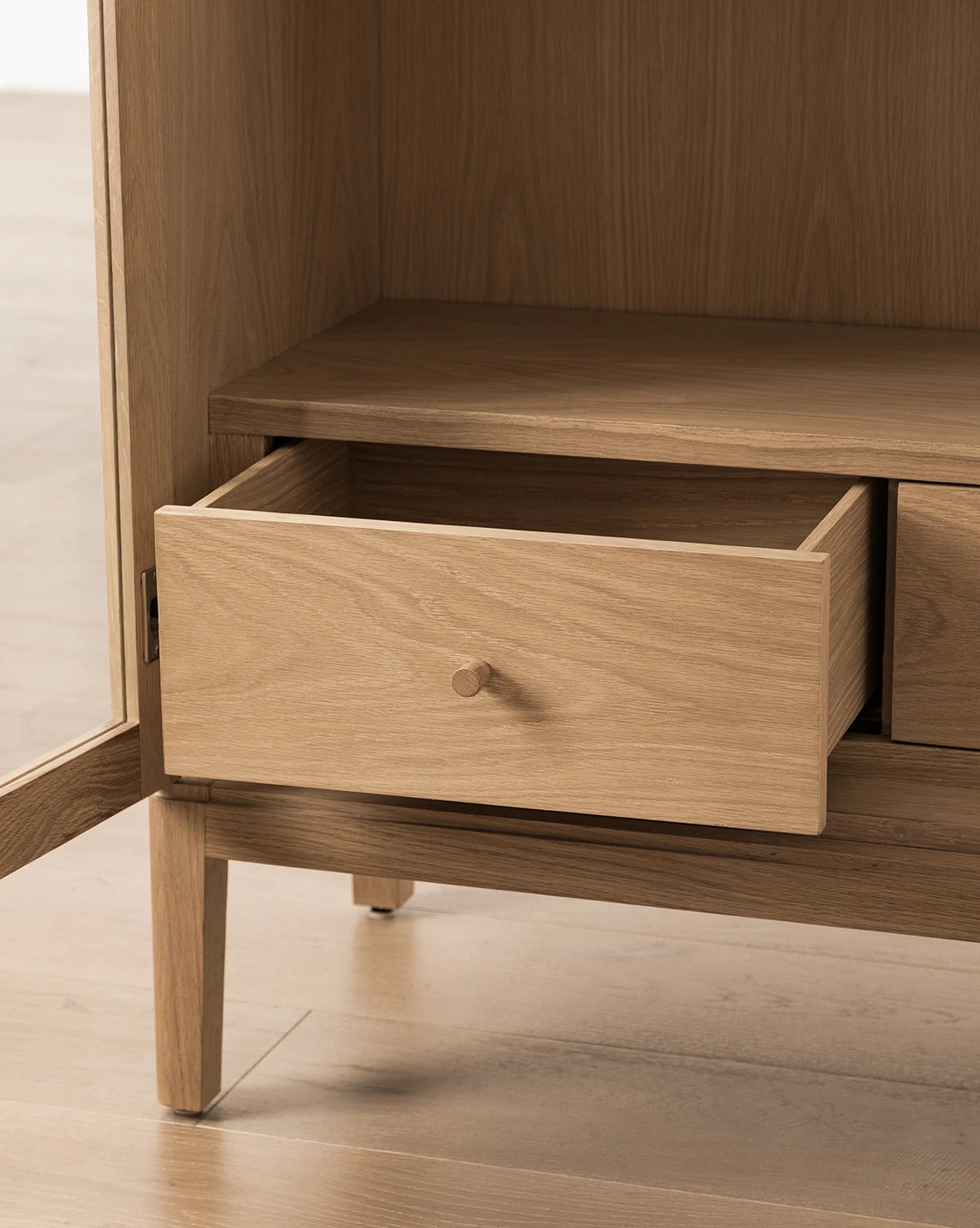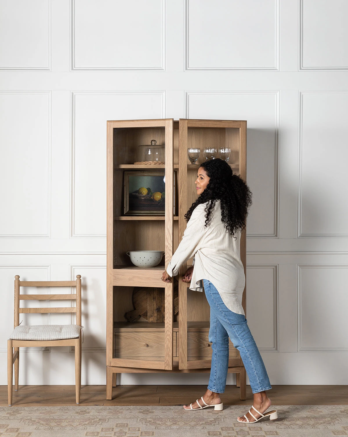 Dynamically designed, the Kensington Cabinet has a neutral, warm white oak finish and a stately form. All tucked inside beautifully framed glass doors, the shelving and drawers inside the Kensington Cabinet add dimension and are perfect for styling your more precious pieces.