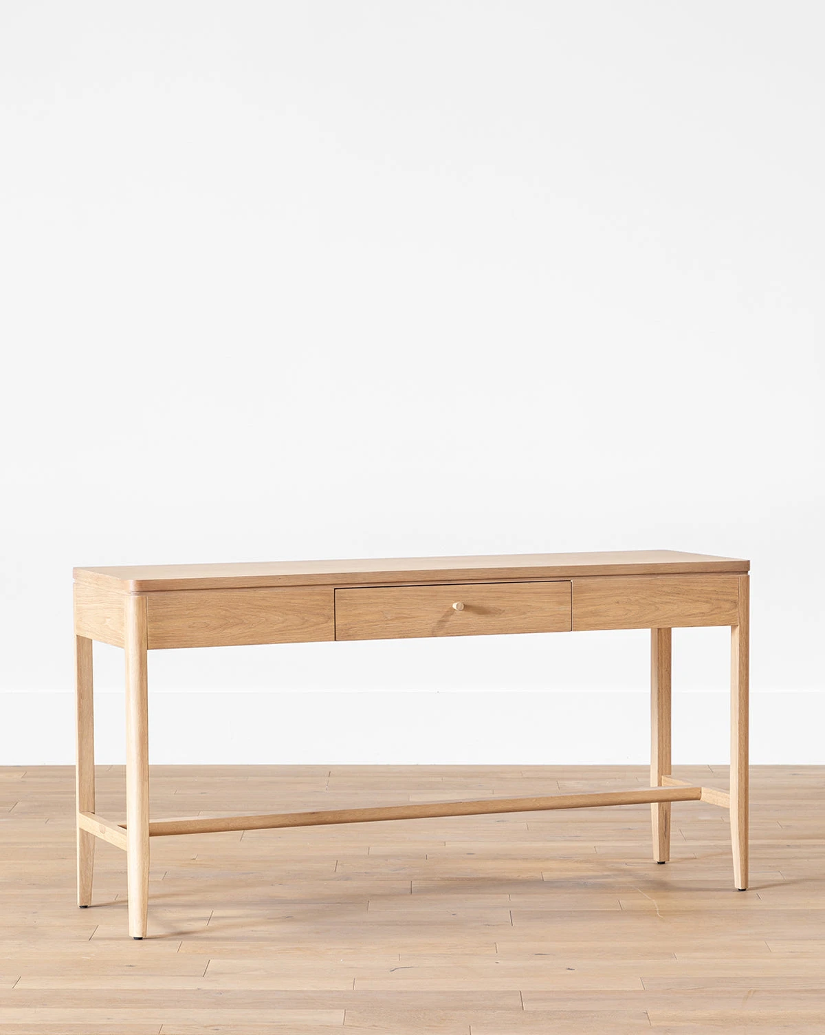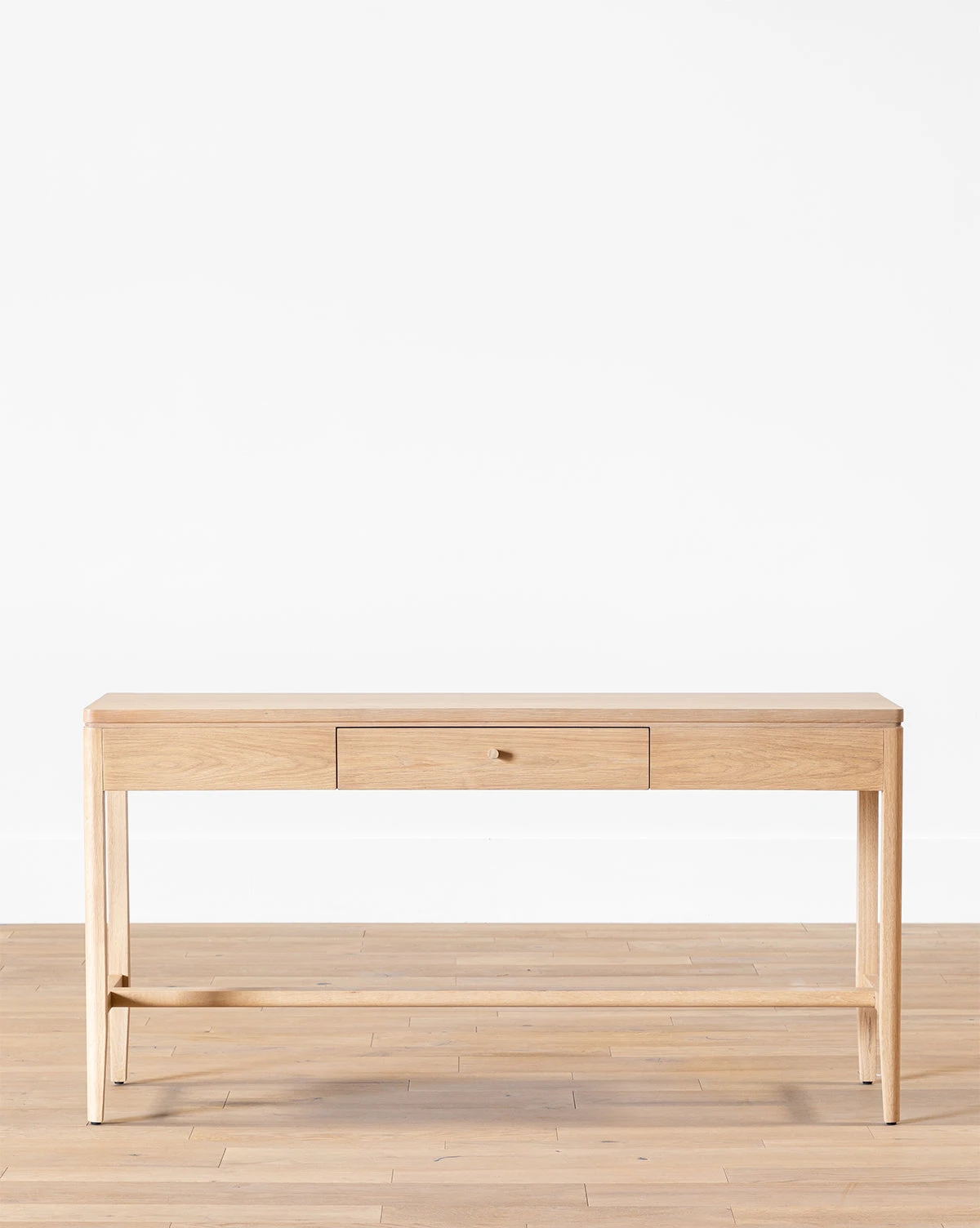 Dynamically designed, the Kensington Console Table has a neutral, warm white oak finish and a stately form. Its single drawer blends seamlessly into the design, with a small wood knob that keeps the table contiguous while adding dimension.